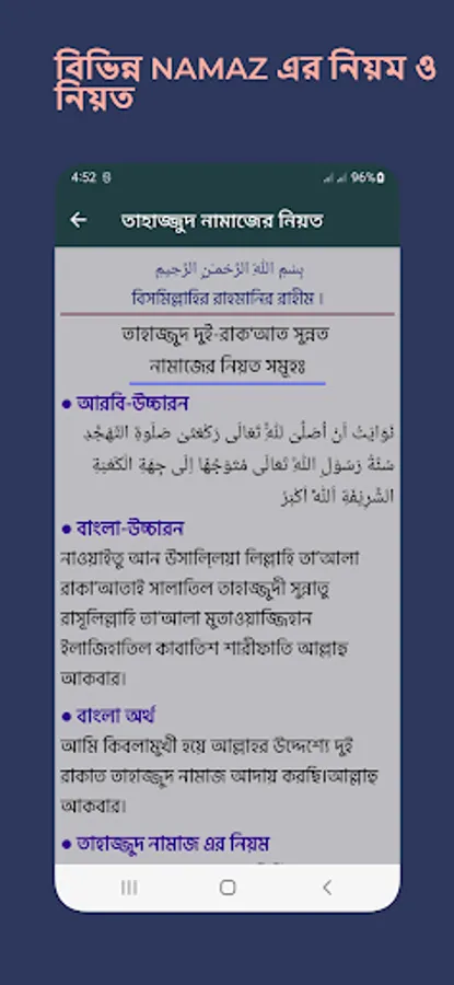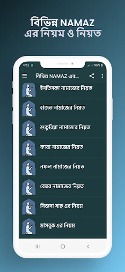 নামাজের নিয়ত,বিতরের নামায পড়িবার নিয়ম,এশা,সালাতুল তাসবীহ নামাজের নিয়ম,সালাতুল হাজত নামাজ,সালাতুল তাসবীহ পড়ার নিয়ম,কাযা নামাযের পড়ার নিয়ম,তাশাহুদ / আত্তাহিয়াতু,কাযা নামাজের বিবরণ ও নিয়ত,ফরয নামাজ,নামায যেভাবে আদায় করবেন,জুমআর নামায,নফল নামাজের নিয়ম,নফল নামাজ সমূহ,তারাবির নামাজের নিয়ম,তাহাজ্জুদ নামাজের নিয়ম