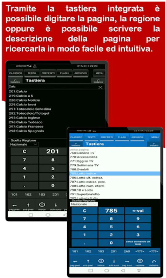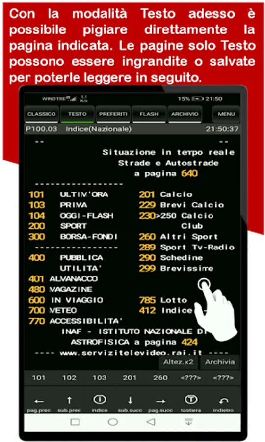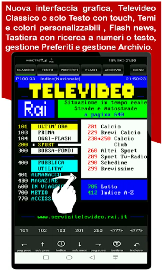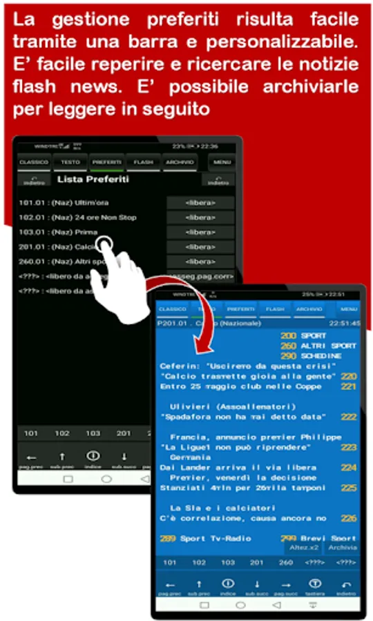 - from the keyboard you can easily get to FRONT PAGE, LAST HOUR, 24 HOURS, FOOTBALL, SPORTS, POLITICS, WEATHER, HOROSCOPE, LOT, LOTTERIES, SUPERENALOTTO