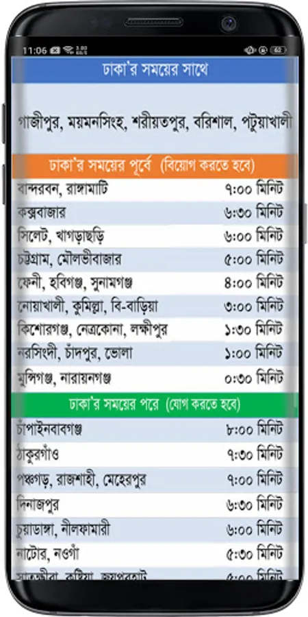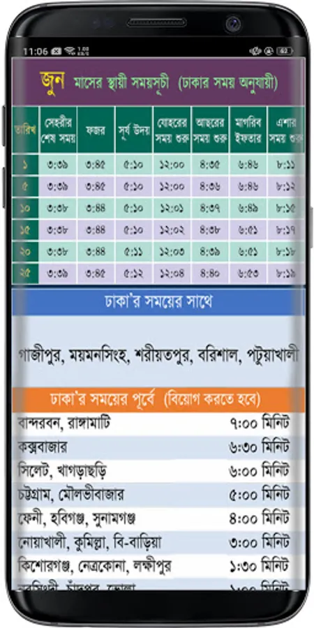 Here is a permanent schedule of prayers and fasting, prepared according to the schedule given by the Bangladesh Meteorological Department in 2012 (according to Dhaka time). It also gives how many minutes to add and how many minutes to subtract in any part of the country.
