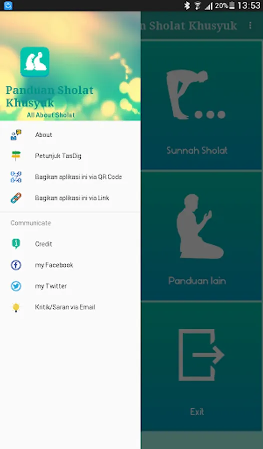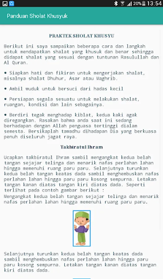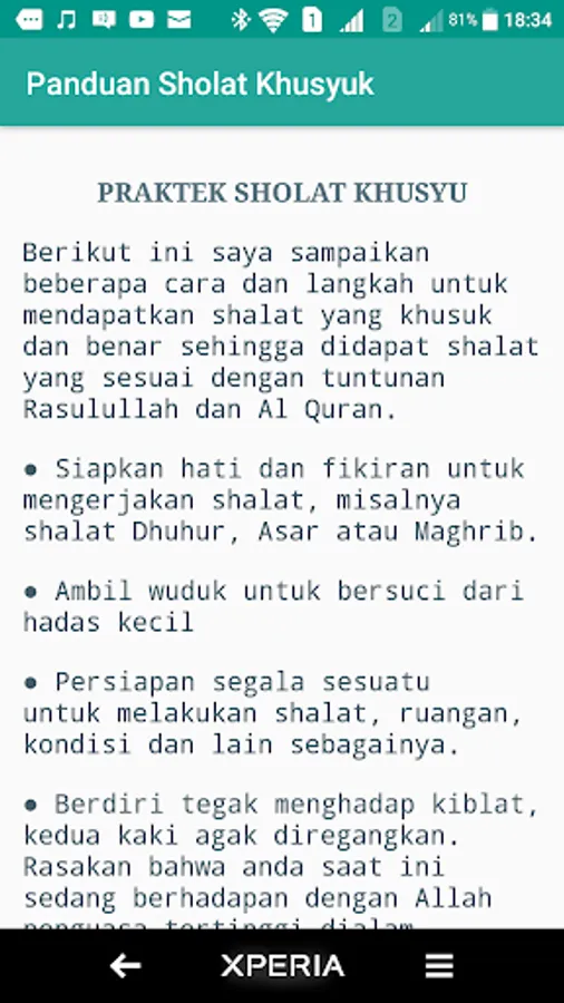 Khusyuk prayer guide is to guide application that can be more solemn prayer through what to do in prayer, which is forbidden until that sunnahkan in prayer. Not only is it in this application there is also a menu "Other Guide" which contains all the relevant guidance prayer. The application also comes with TasDig (Digital rosary) is simple and easy to use.