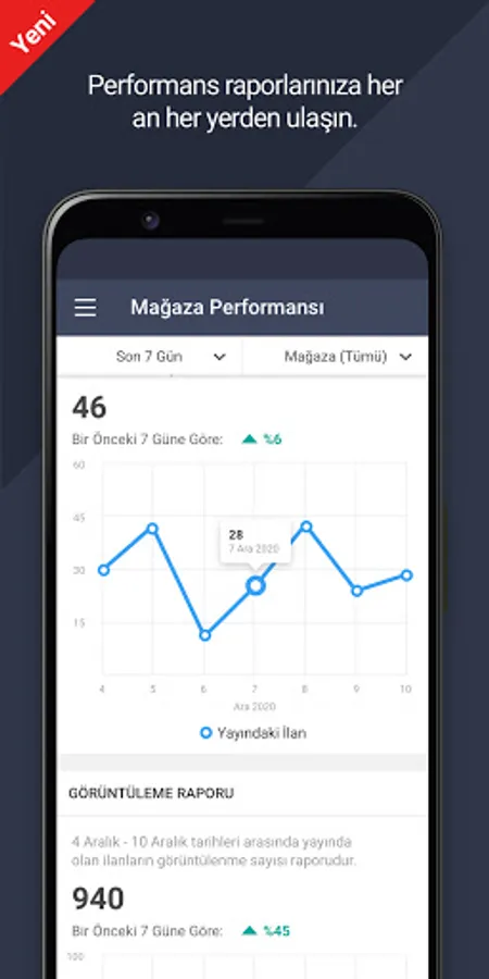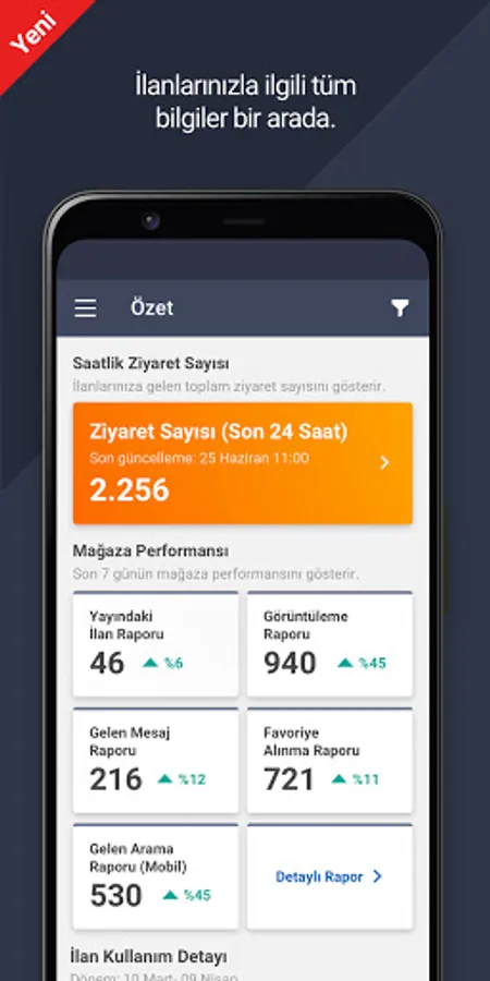- Performans Raporu ile yayındaki ilan sayısı, ilanlarınızın görüntülenme, mesaj ve favoriye alınma sayılarındaki değişimlerini kullanıcı bazlı ve dönemsel olarak takip edebilirsiniz.