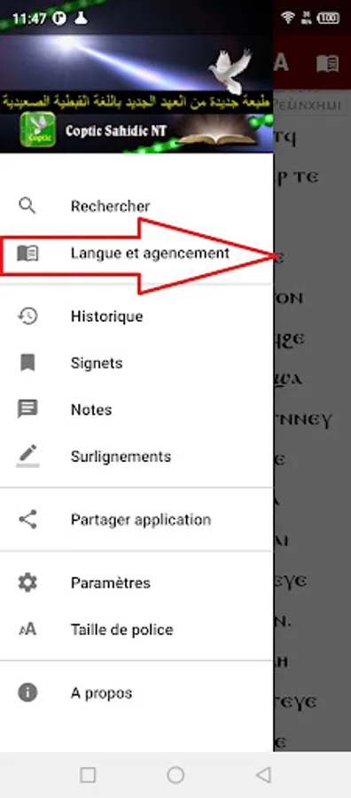 - «verset par verset» pour afficher un verset en Coptic suivi du même verset en anglais ou en arabe ou en français.