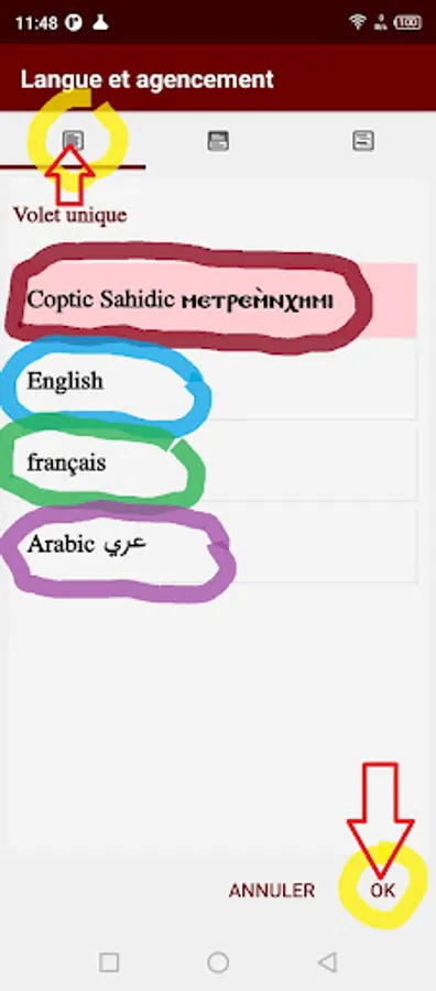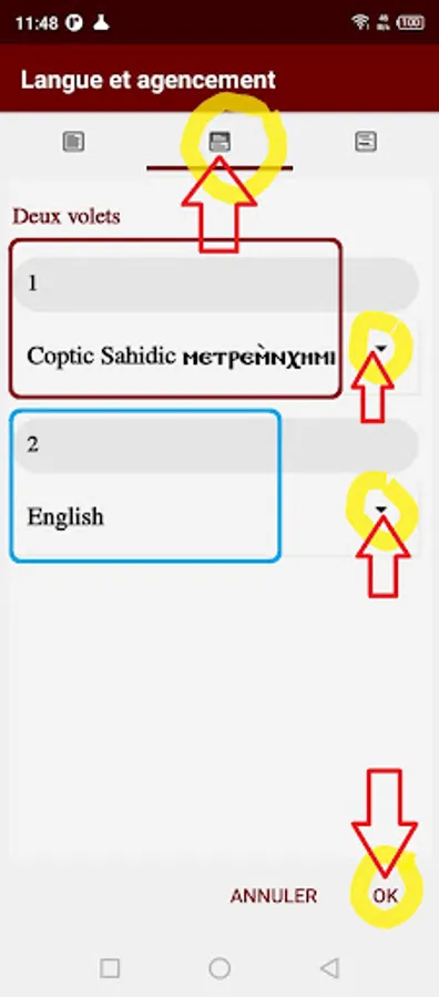 - «deux volets» pour afficher le Coptic en haut et parallèlement la version anglaise ou arabe ou bien française en bas