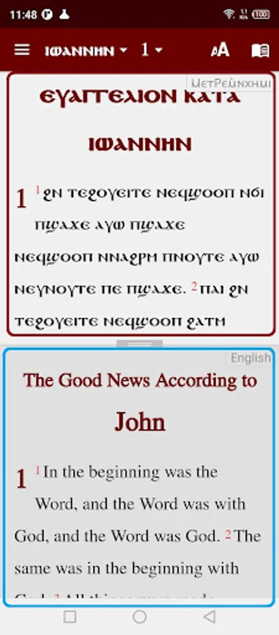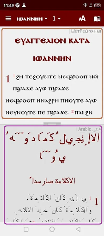 - "two panes" to display the Coptic at the top and the English or Arabic or French version at the bottom