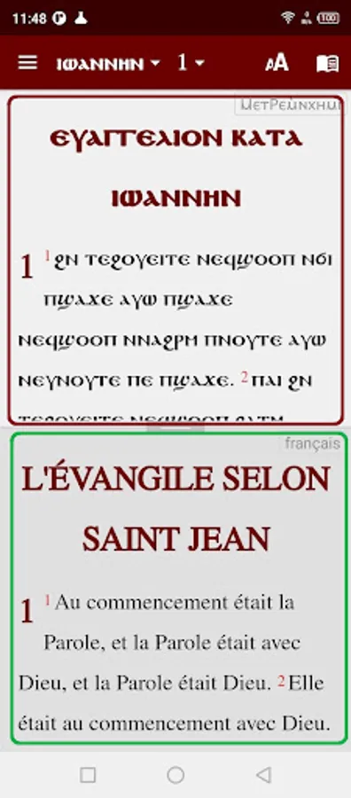 - "verse by verse" to display a verse in Coptic followed by the same verse in English or in Arabic or in French.