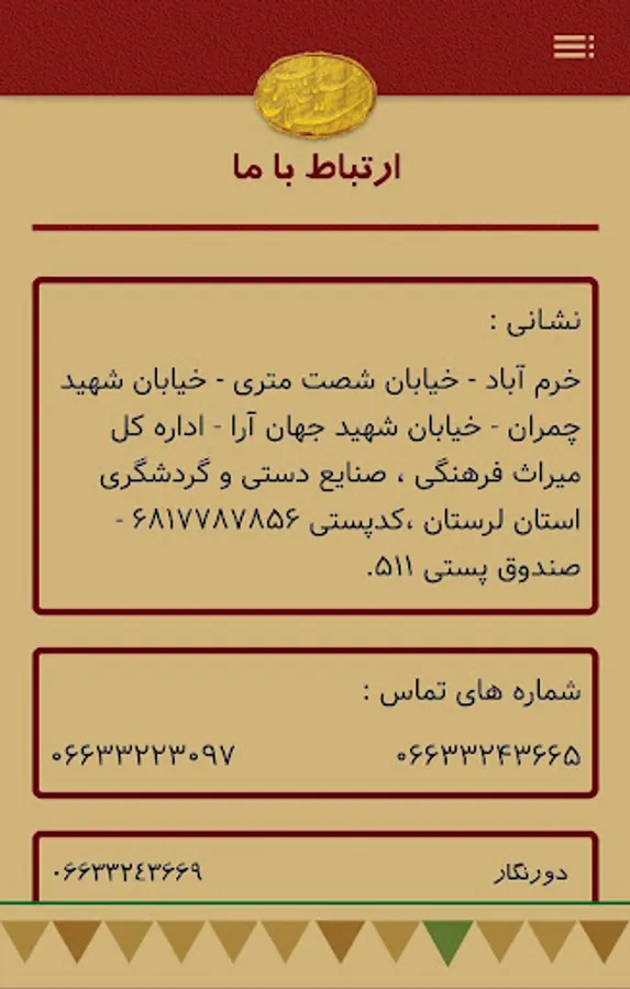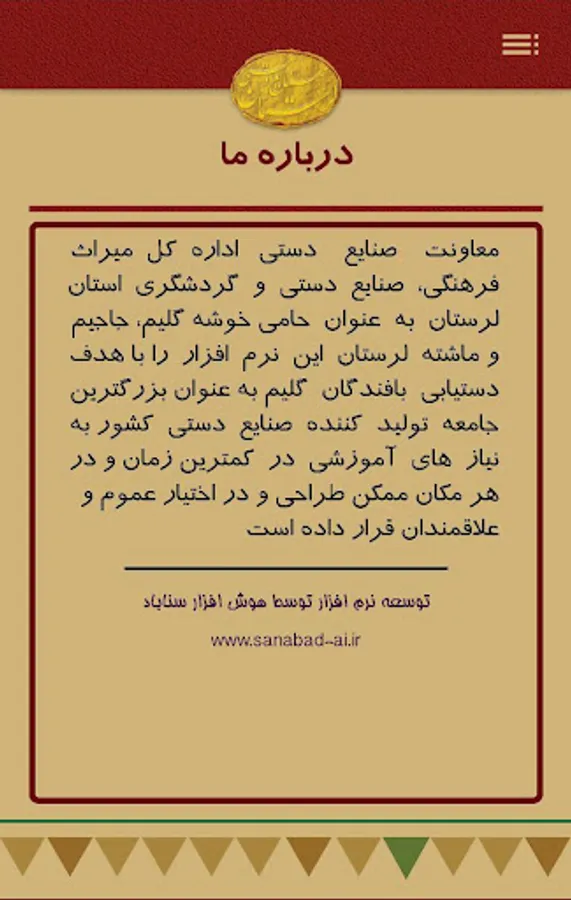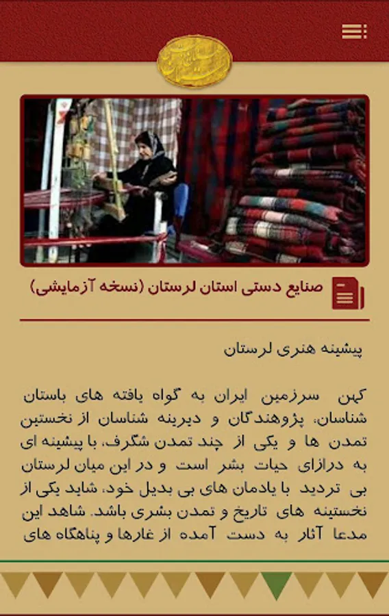 اپلیکیشن کتابچه صنایع دستی استان لرستان با هدف معرفی صنایع دستی این استان و دسترسی هرچه بیشتر و بهتر علاقمندان به اطلاعات صنعتگران و صنایع دستی استان لرستان توسط اداره کل میراث فرهنگی، صنایع دستی و گردشگری استان لرستان طراحی و اجرا شده است.
