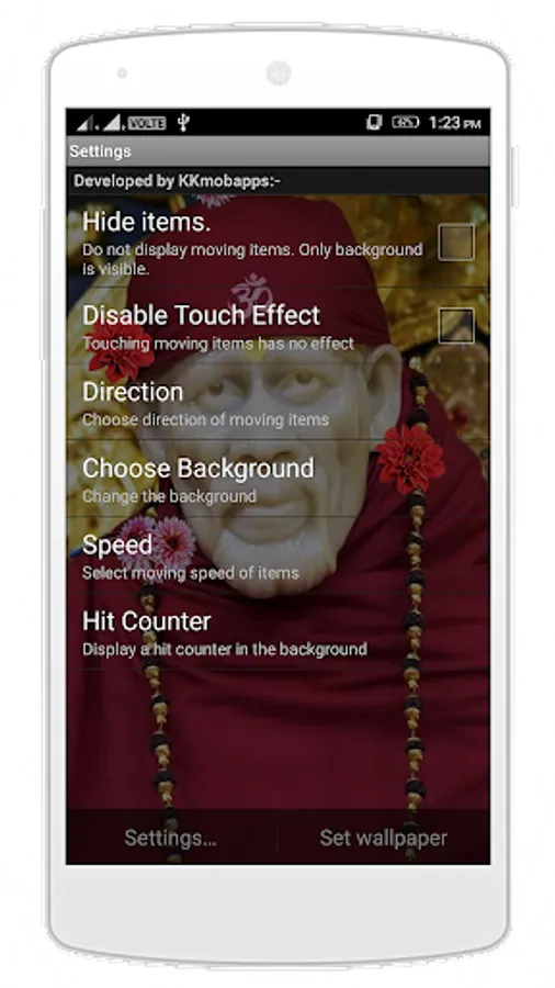 SaiBaba Live Wallpaper is Absolutely Free App. This wallpaper Consumes low battery power. In This Live Wallpaper there are various different pictures of Lord SaiBaba .You can change images from setting choose your favorite image of lord SaiBaba and set to wallpaper and feeling bless.