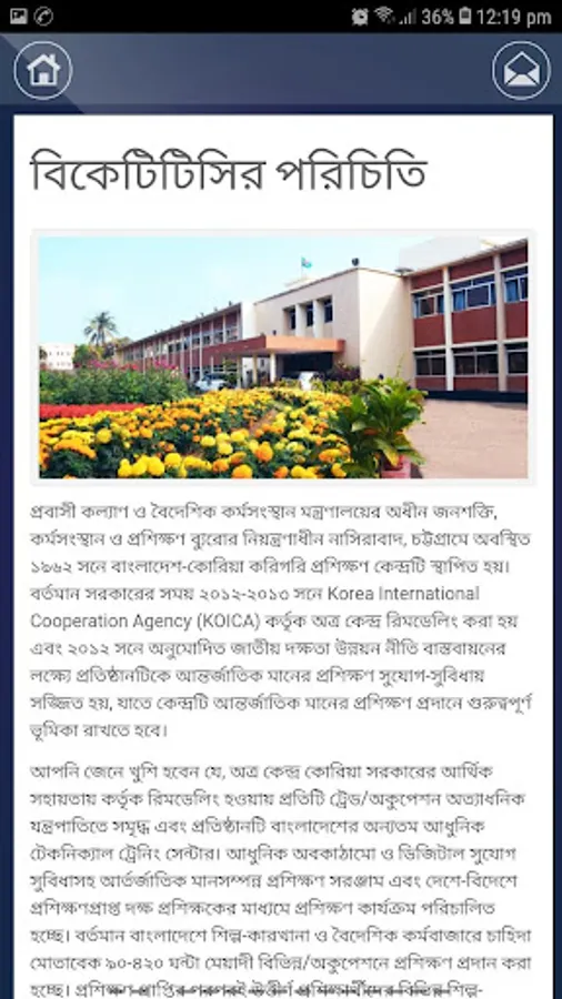 The center is remodeled by the mission of providing quality TVET program (i.e) Competency Based & Assessment (CBT&A), that will prepare competent graduates in different occupation for the world of work with the capacity to contribute to national development. This center is going to be the pioneer in CBT&A in Bangladesh with the most comprehensive training package and other first-class facilities. Korean Government has created this opportunity through KOICA. We are grateful to them and appreciate their effort & cooperation. The BKTTC, Chittagong to the cause of top quality technical training with the motto of taking you tomorrow's technology. The exemplary infrastructural facilities, the team of highly dedicated faculty and the exhilarating atmosphere in the campus will surely take you to enviable heights in your capabilities and achievements. We offer a wide range of technical & professional programs for school leavers, TVET trainer, technicians and those seeking new carrier paths. If you choose to participate in any of our CBT&A programs, you should expect to be accorded the greatest level of skill and to be immersed in structural learning activities that are engaging, mentally inspiring and that encourages and motivates you to be a lifelong learner. In CBT& A system our students centered, self-paced approach to the design & delivery of instructions, will afford a learning environment that is conducive to meeting your learning needs which lead you to a gainful employment. Please go through our brochure and browse our website www.chittagongbkttc.gov.bd. I believe you will find your courses that suit your learning needs. Furthermore as part of our continuing process improvement, please give us feedback on how to improve its interface & usefulness.