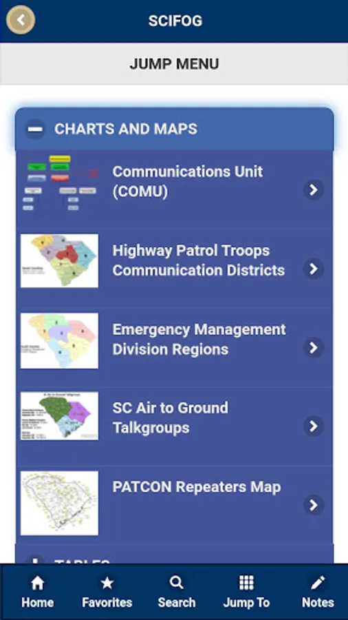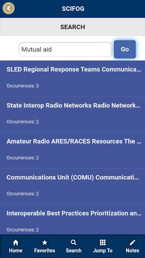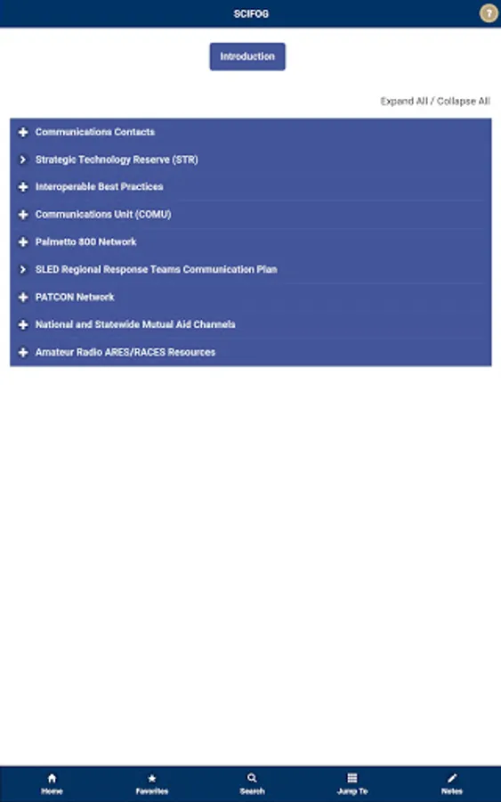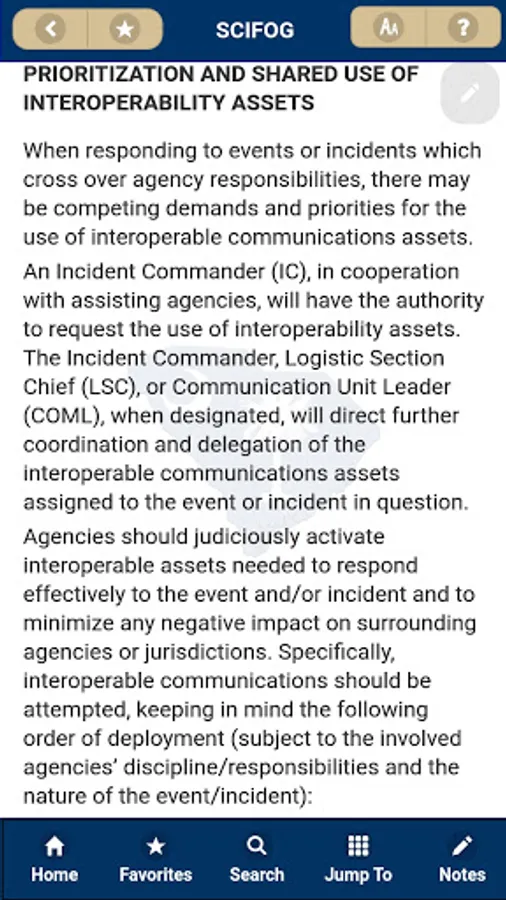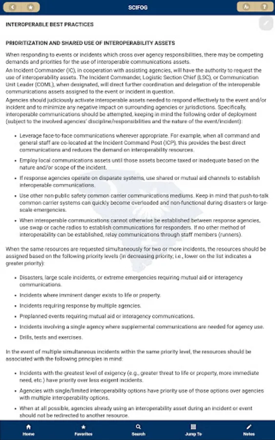 The SCIFOG mobile app gives users easy access to public safety communications information, offering a content index with links for quick jumps to reference sections, tables, figures, or images. The ability to save Favorites and create in-line notes enables personalized access to critical information. SCIFOG can be downloaded and then taken to the field as an offline reference, to be used without the need of an Internet connection.
