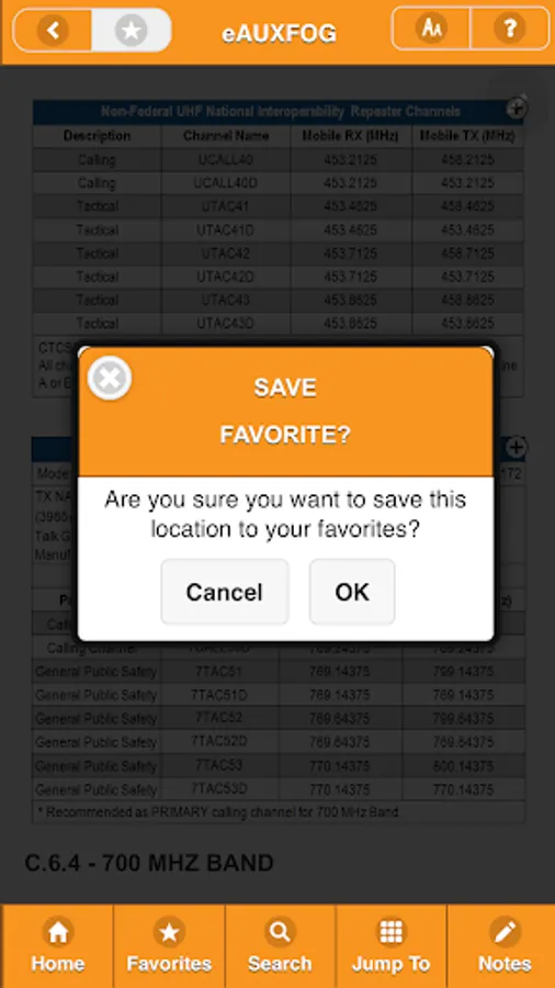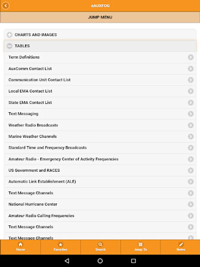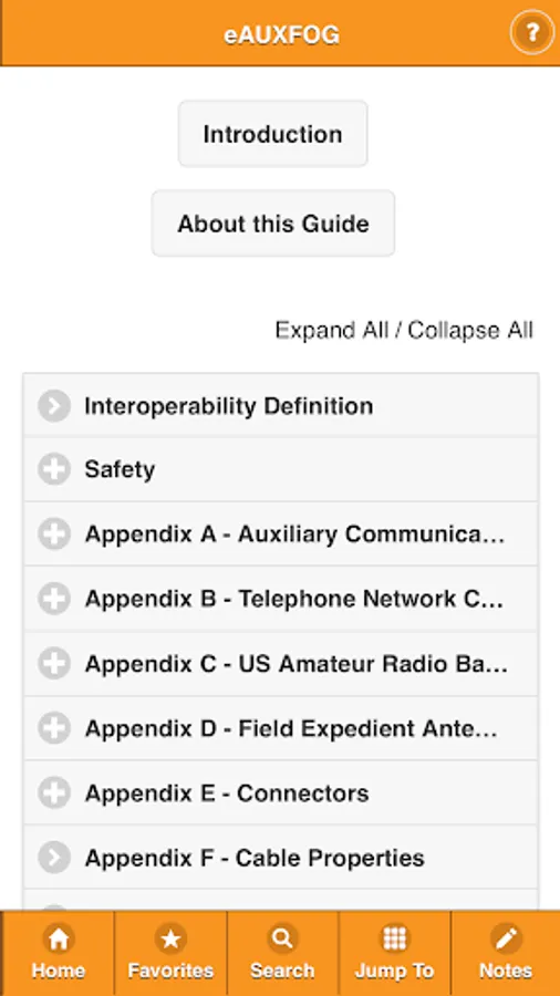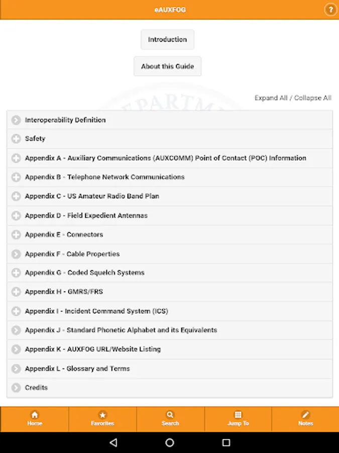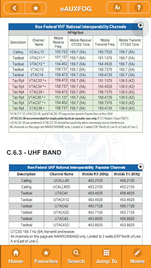 eAUXFOG mobile app is an electronic reference of the Auxiliary Communications Field Operations Guide. The eAUXFOG is a technical reference for emergency communications planning and for radio technicians responsible for radios that will be used in disaster response. It includes rules and regulations and other interoperability channels, tables of frequencies and standard channel names, and other reference material.