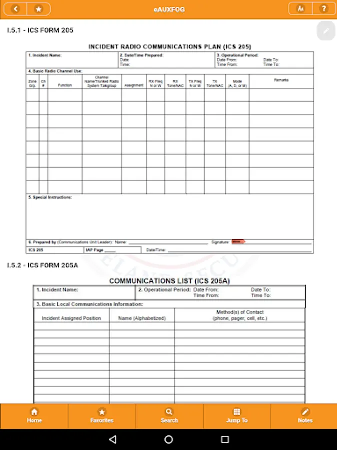 The eAUXFOG mobile app gives users easy access to public safety information, offering a content index with links for quick jumps to reference sections, tables, figures, or images. Navigation links allow users to jump directly to regional quick references as well as add customizable bookmarks called Favorites to develop their own personalized access to critical information for their territory. eAUXFOG can be downloaded and then taken to the field as an offline reference, to be used without the need of a cellular or data connection.