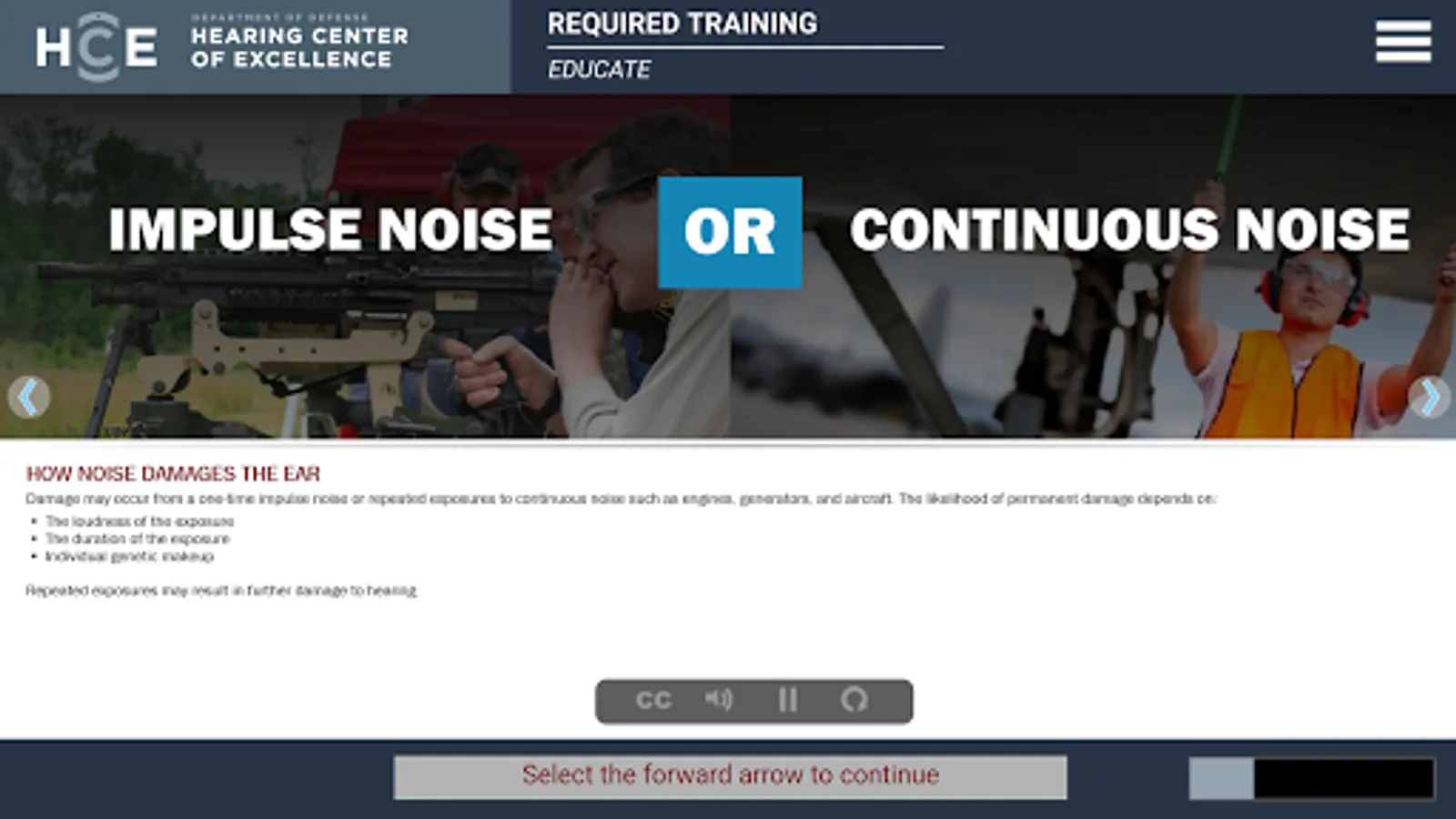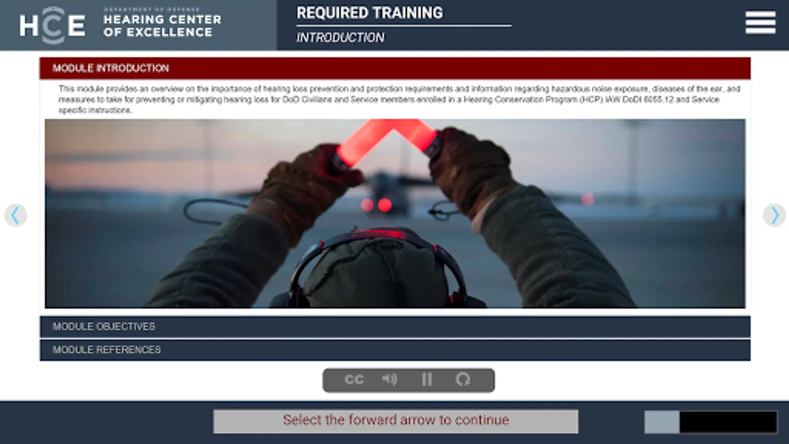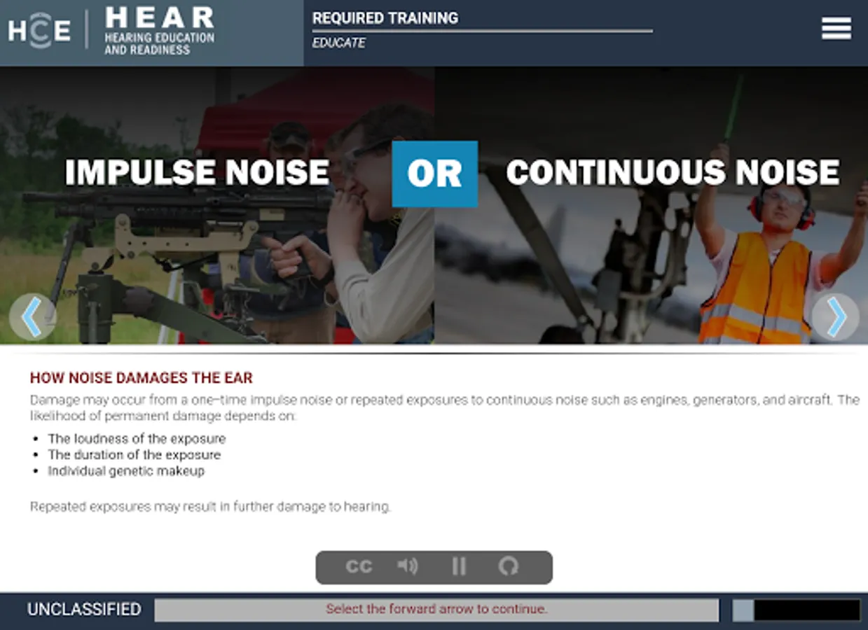 The purpose of the "Hearing Education and Readiness" course is to provide an overview on the importance of hearing loss prevention and protection requirements and information regarding hazardous noise exposure, diseases of the ear, and measures to take for preventing or mitigating hearing loss for DoD Civilians and Service Members enrolled in a Hearing Conservation Program (HCP) IAW DoDI 6055.12 and Service specific instructions. This course is provided by the DoD Hearing Center of Excellence.
