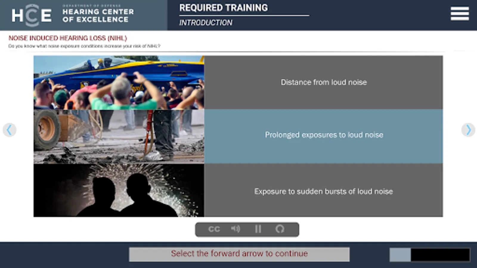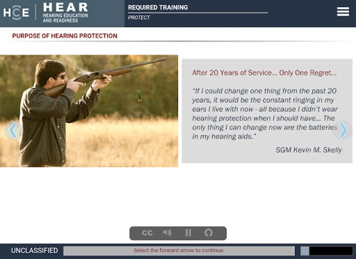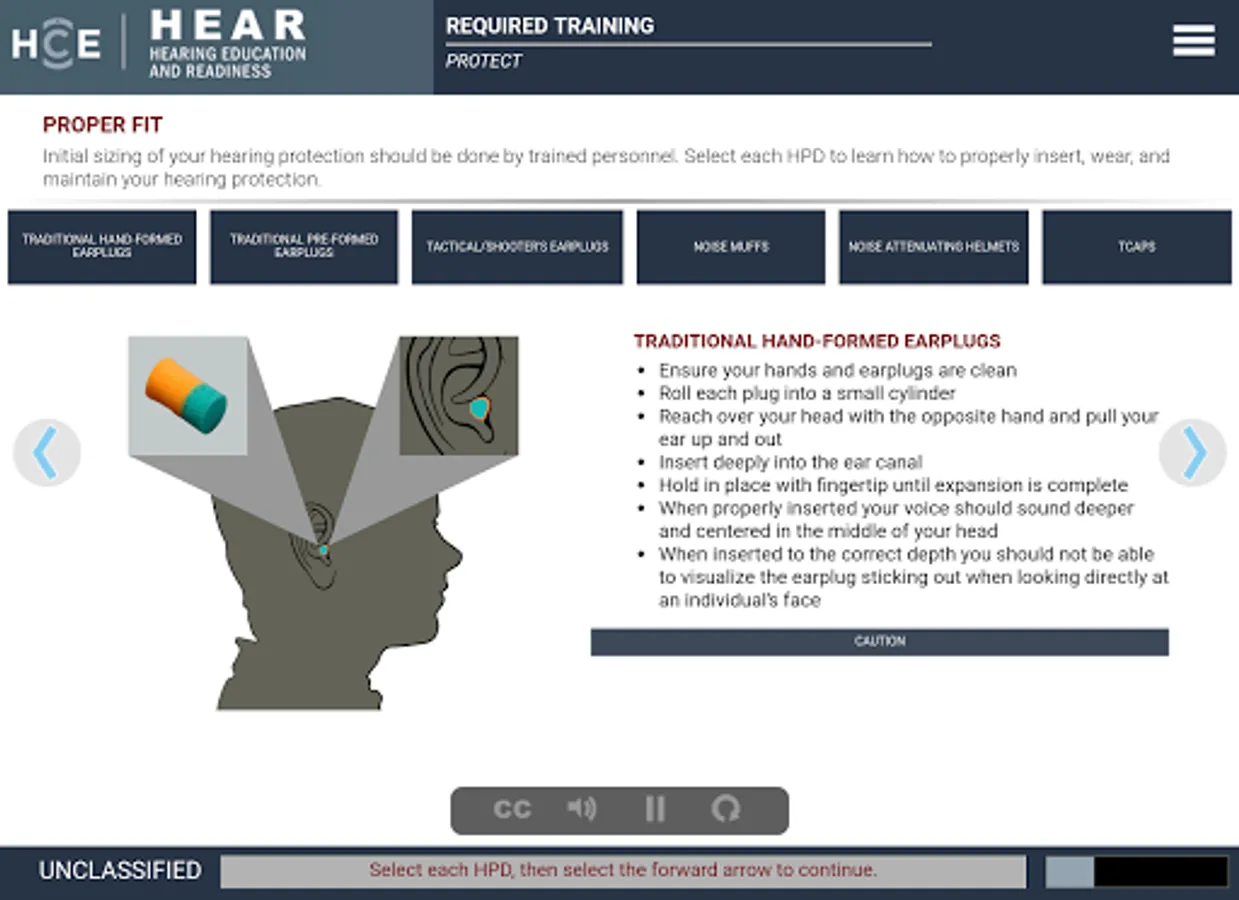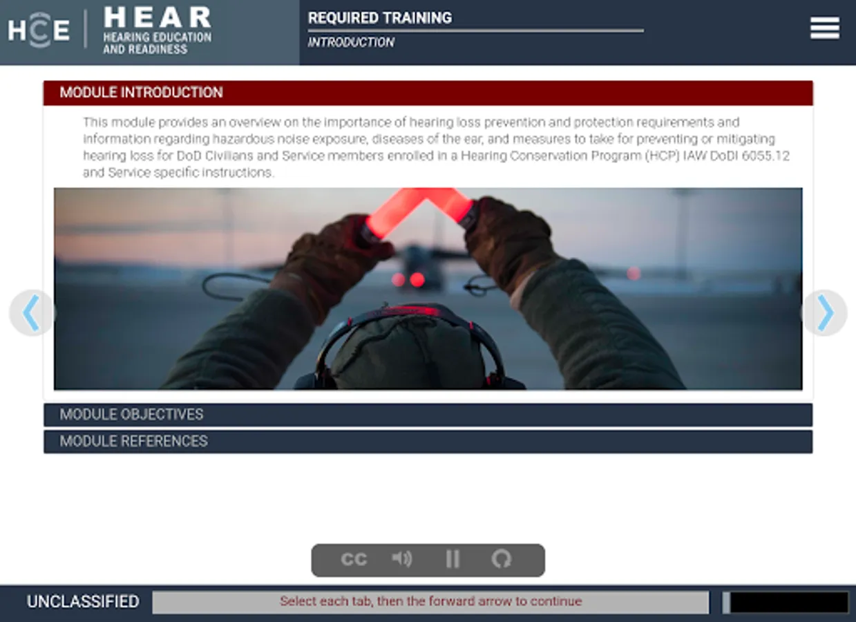 The purpose of the "Hearing Education and Readiness" course is to provide an overview on the importance of hearing loss prevention and protection requirements and information regarding hazardous noise exposure, diseases of the ear, and measures to take for preventing or mitigating hearing loss for DoD Civilians and Service Members enrolled in a Hearing Conservation Program (HCP) IAW DoDI 6055.12 and Service specific instructions. This course is provided by the DoD Hearing Center of Excellence.
