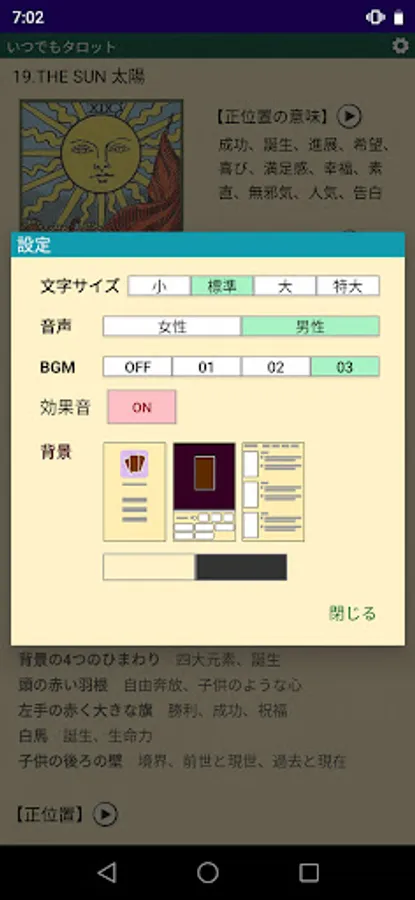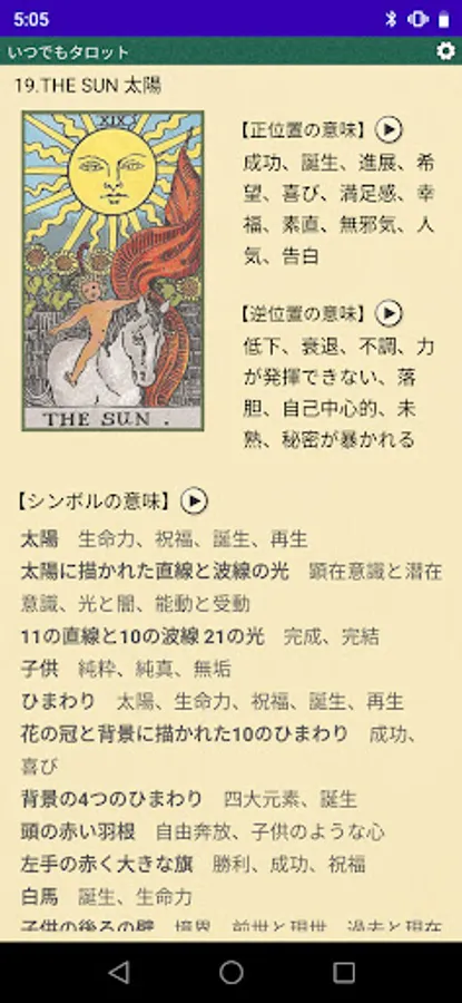 On the detail screen of each card, in addition to the meaning of the normal position and the reverse position, there are meanings, explanations of symbols, etc., all of which can be read aloud.