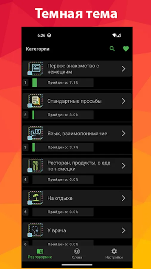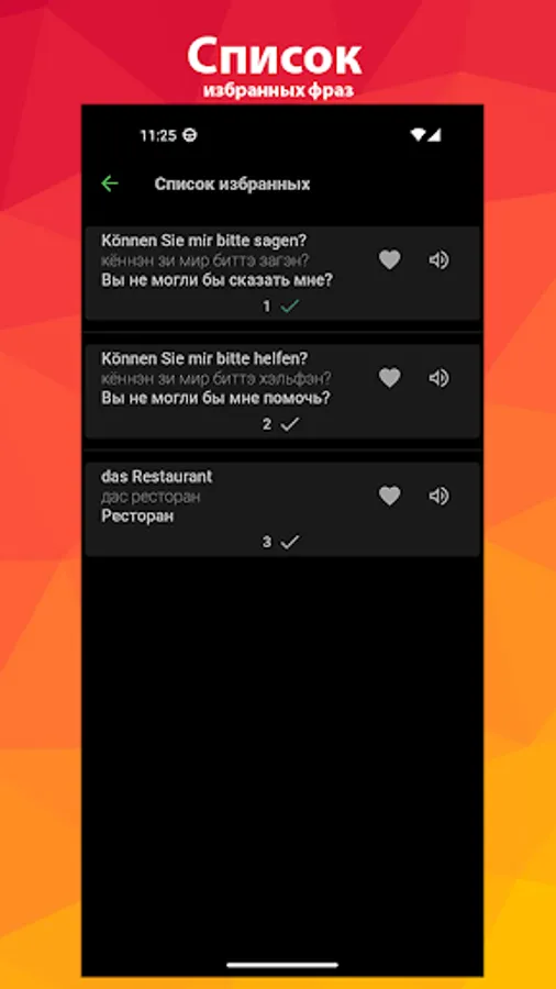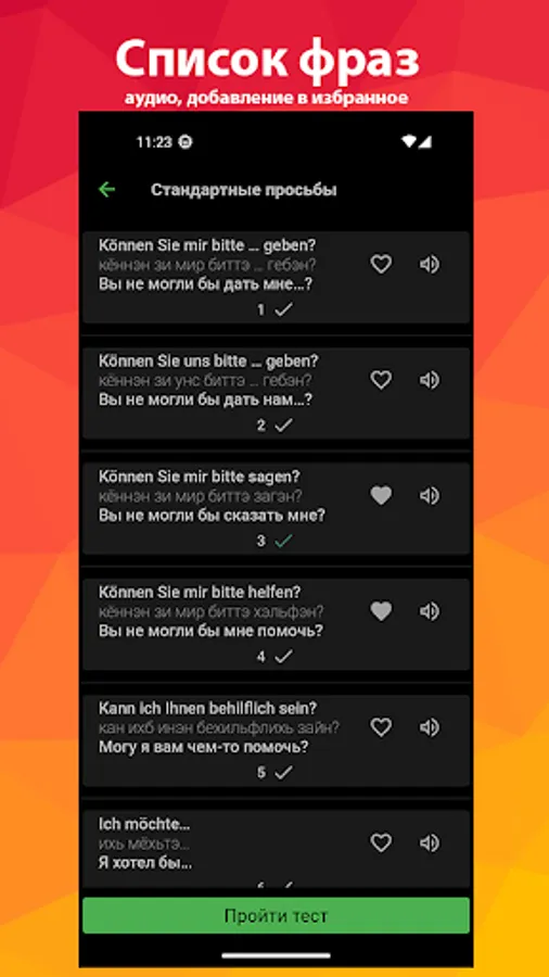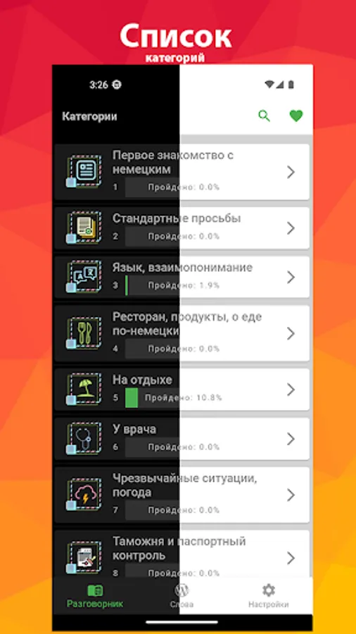 For convenience, the Russian-German offline phrasebook is divided into categories: Greetings, Gratitude, Politeness formulas, Travel, Restaurant, Food, Products, Attitude, etc.