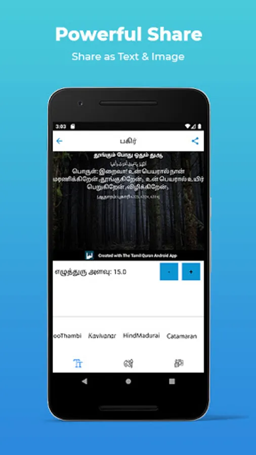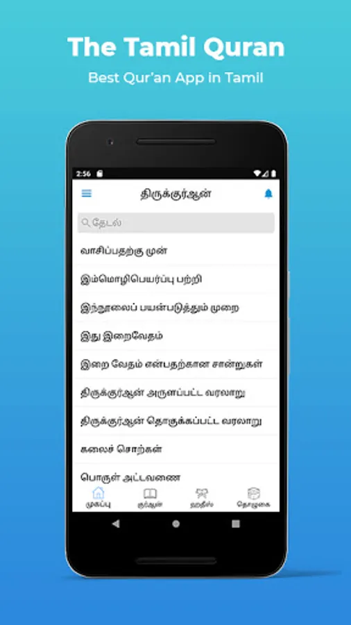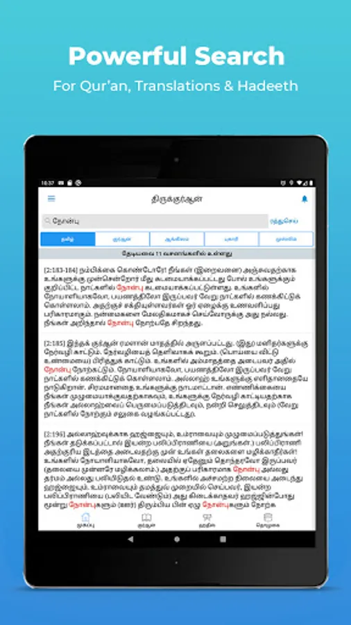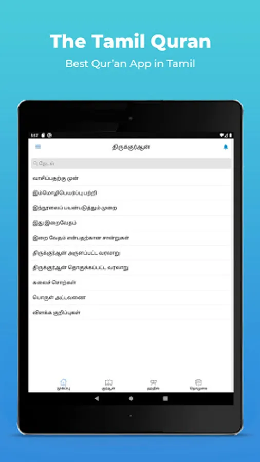 • Search & Filter - App offers best in class full text search for Tamil, English translations and the Arabic Qur'an content. Qur'an verses can also be filtered based on Surah (Chapter) and by a specific verse number. You can navigate to the search content and share/send them.