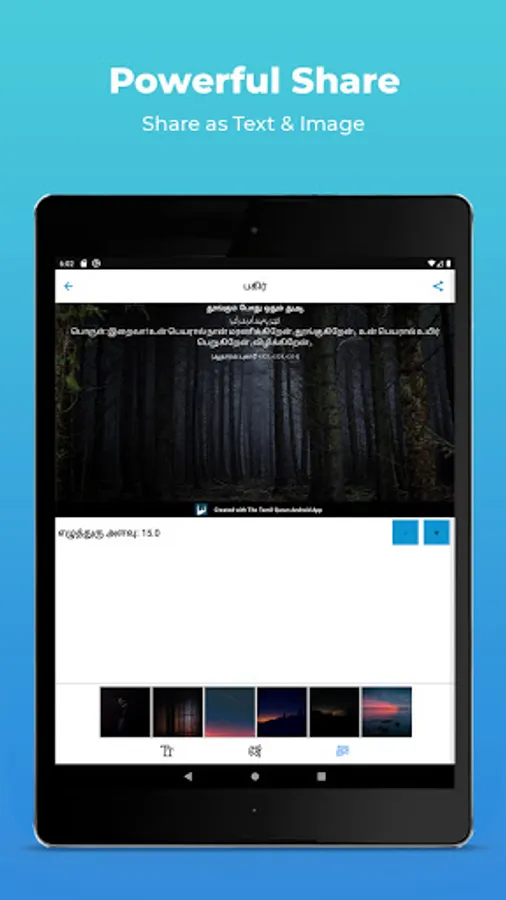 • Share - App offers the ability to share Tamil and English translation texts in text and image format to any social media applications including Facebook, Whatsapp, Telegram, Email, etc.,