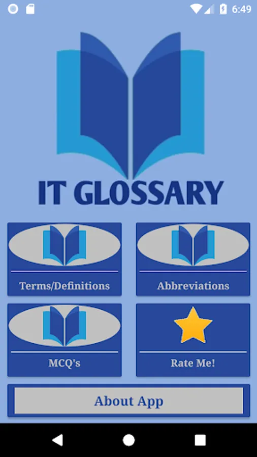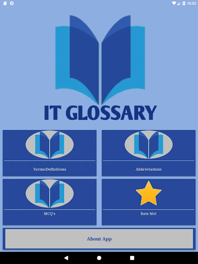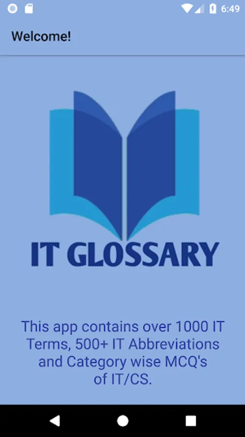 IT GLOSSARY is an android dictionary application. The goal of IT Glossary is to make IT/Computer terminology easy to understand and also provides abbreviations with full forms. This application is specially developed for help of students (IT/Computer science and Software Engineering). Added MCQ's which are very helpful for students in different exams.