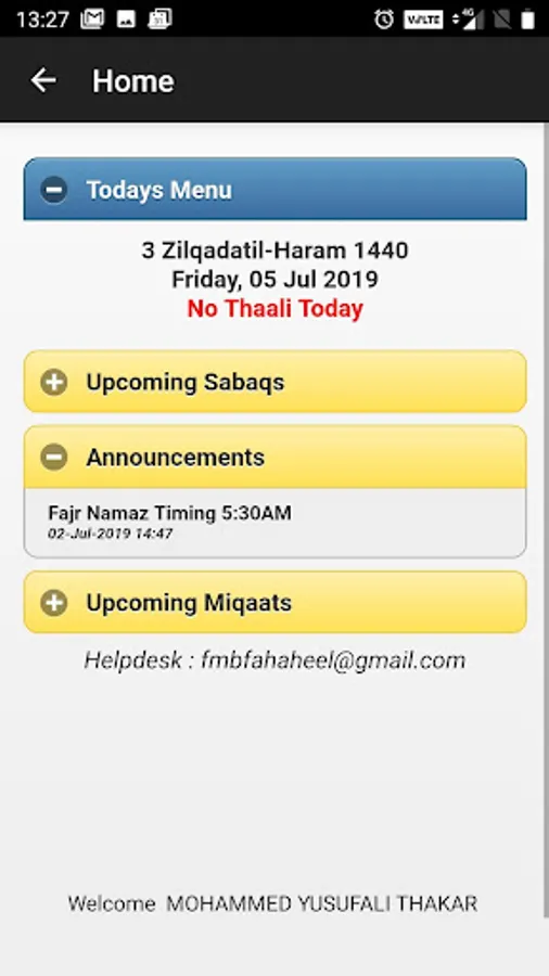 App Features: (1) Jamaat Announcements/Communication (2) FAIZ UL MAWAID IL-BURHANIYAH Management (2) RSVP (4) FMB Menu (5) Thaali Delivery Status (6) Stop Thaali Request (7) Sabaq Management