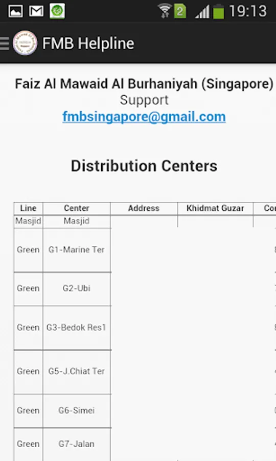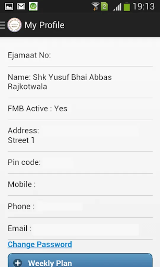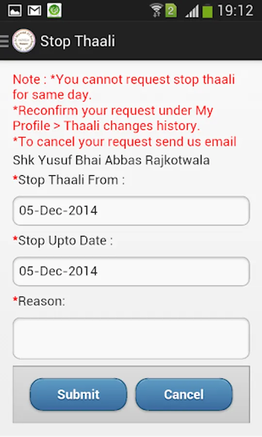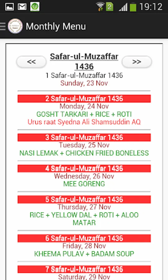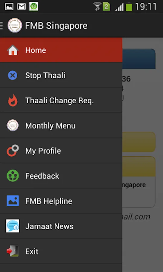 Features: (1) Announcements/Communication (2) FMB Menu (3) Thaali Delivery Status (4) Stop Thaali Request (5) Thaali Change (6) Niyaaz & Payment History