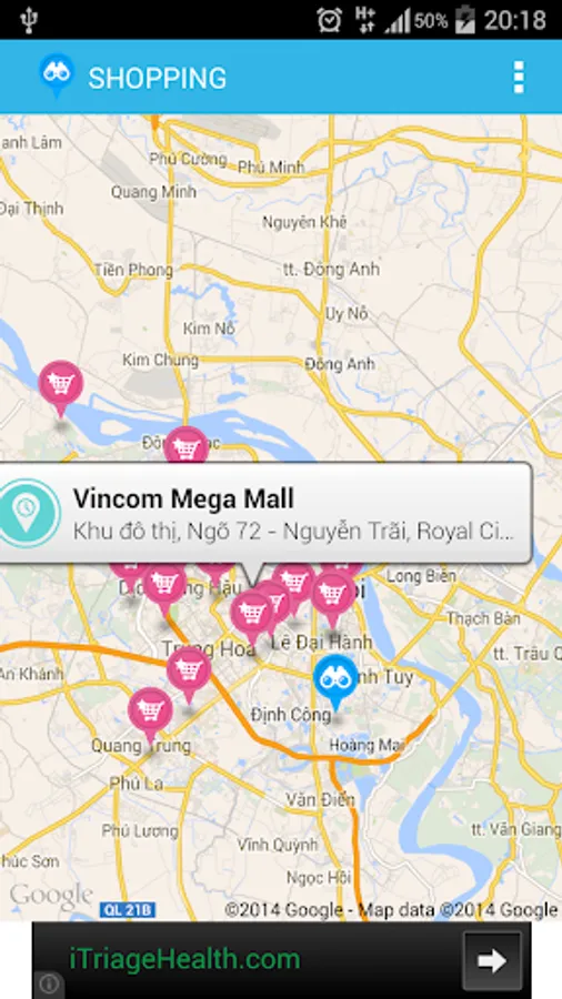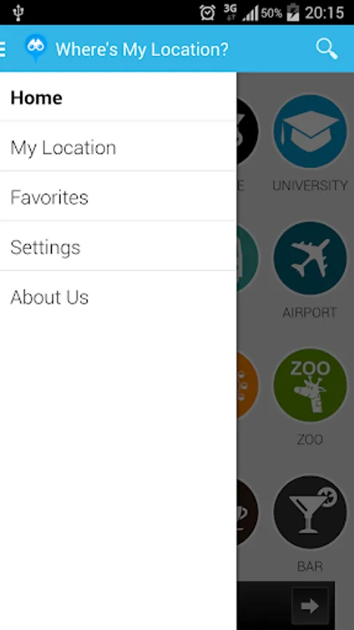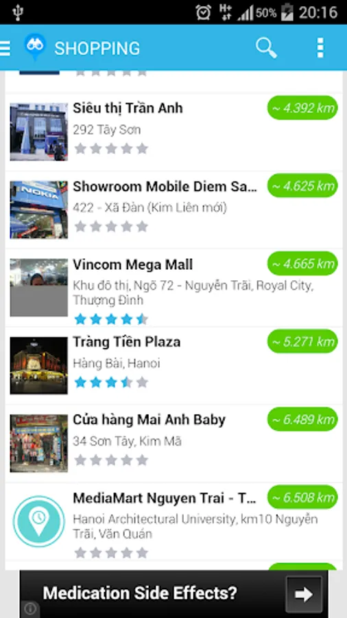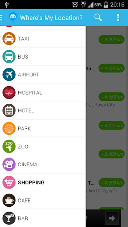 • Selection of KM/Mile as per preference. Users can find places nearby by choosing one of the displayed categories or do a simple search to find them. In both cases the search radius can be increased/decreased between 1km to 50 km.