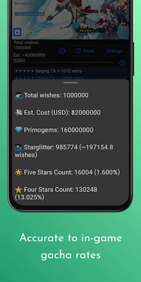 ✦ True to in-game gacha rates including pity AND soft pity. Simulation across 1,000,000 wishes: 1.600% for 5-star, 13.025% for 4-star.