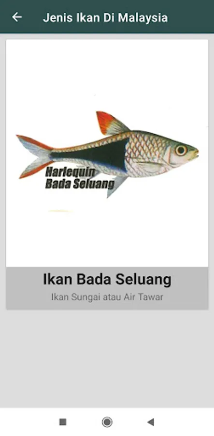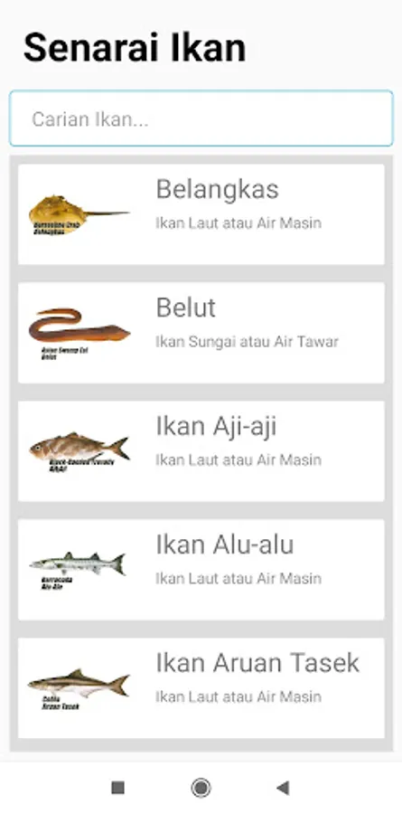 Displays a list of types of river fish or sea fish found in Malaysia.
