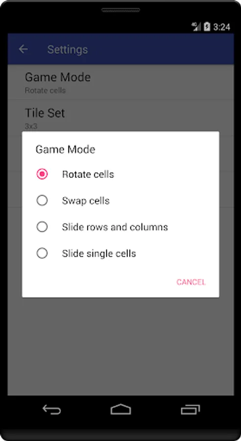 Several modes: rotate tiles, slide entire rows and colums, slide single cells, swap cells.