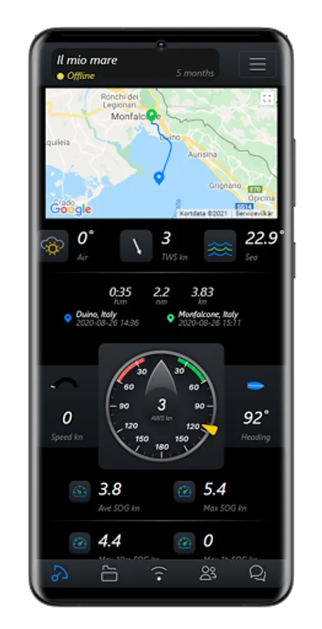 Sailserver can be connected to the boat instruments and collects data like wind direction and speed, water depths and temperature, Speed through water, boat heeling and much more.