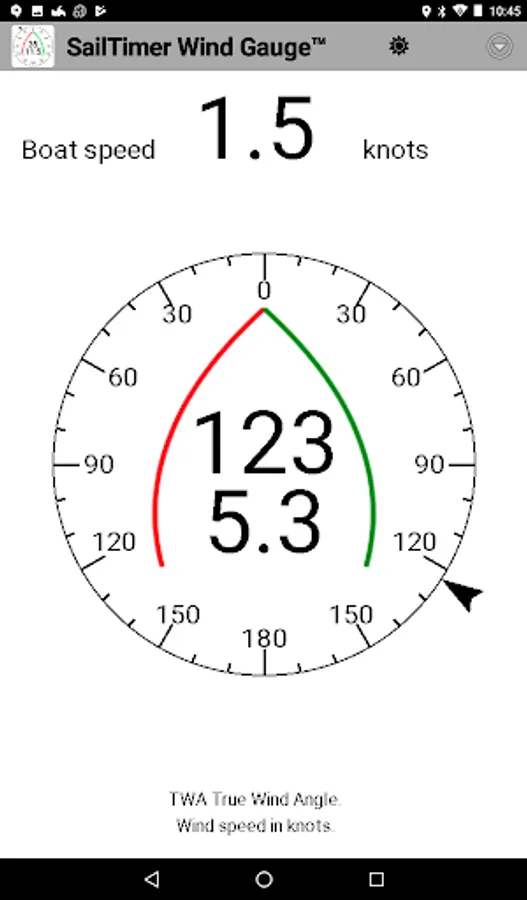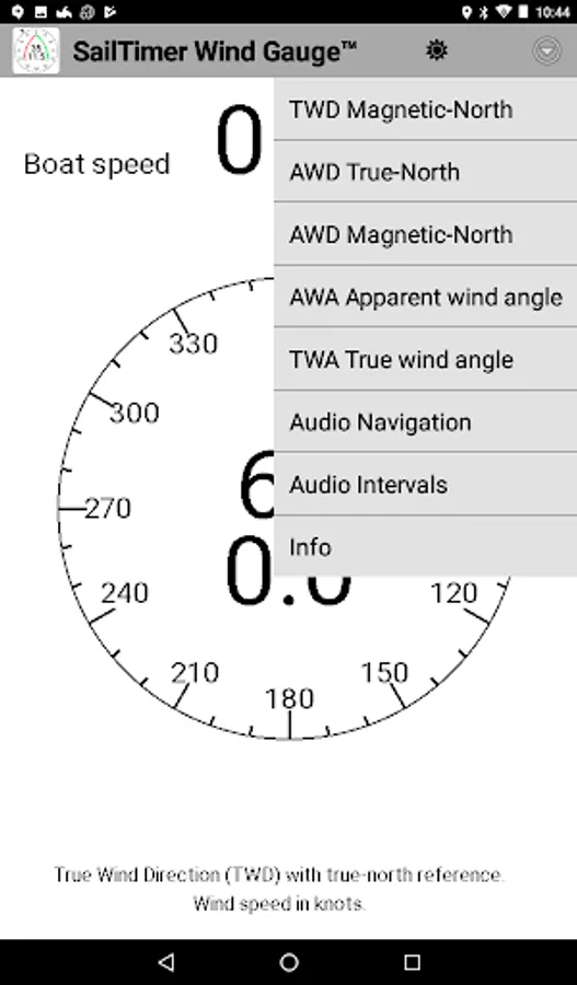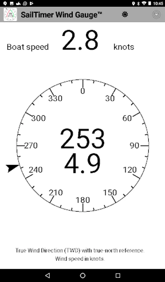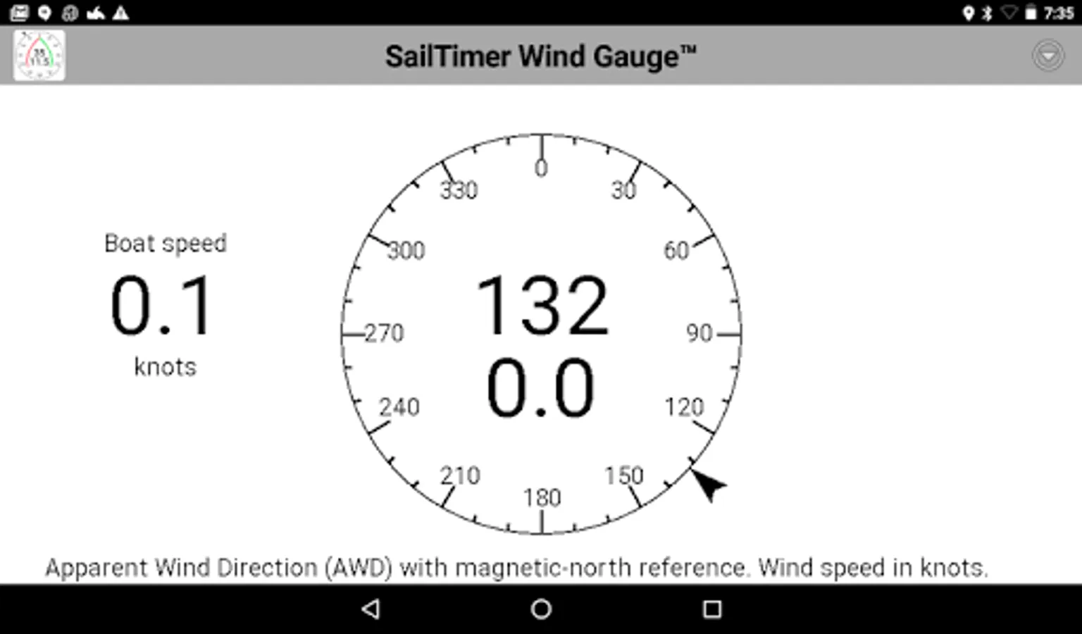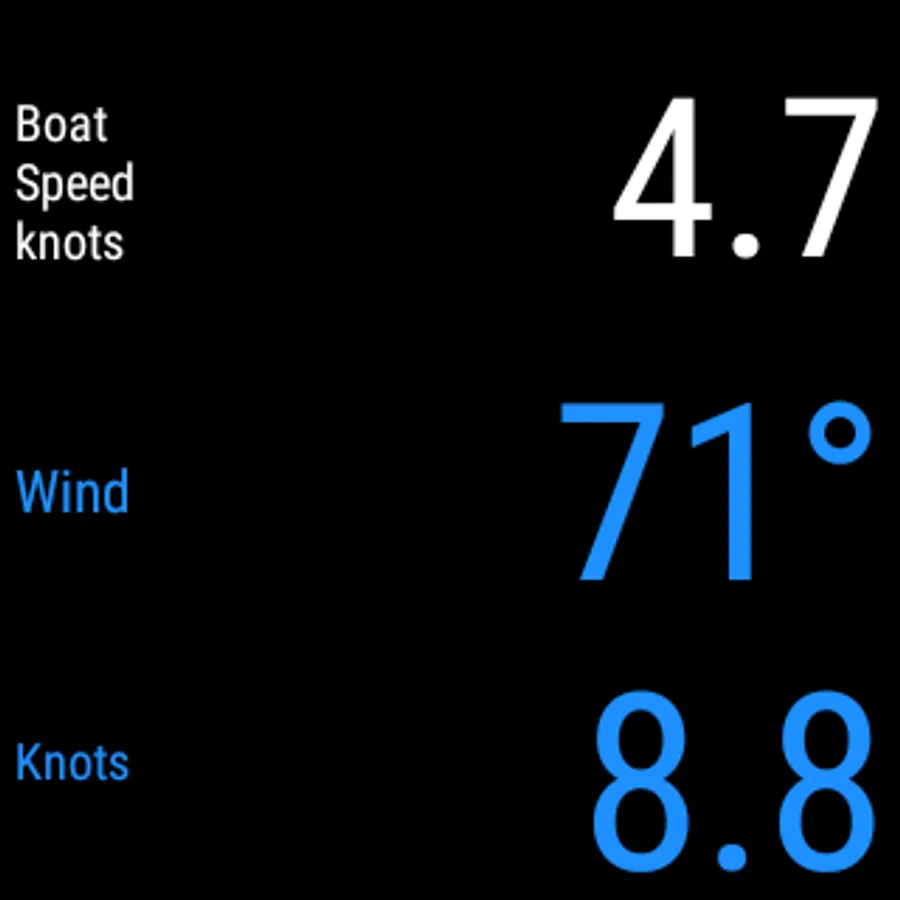 This app includes a traditional wind angle display showing wind from 0-180 degrees on port or starboard. There is also wind direction on a standard compass display, in both Magnetic-North and True-North reference. Boat Speed is also displayed for a simple interface with the main parameters you want.