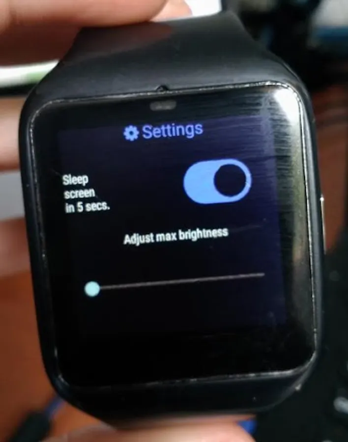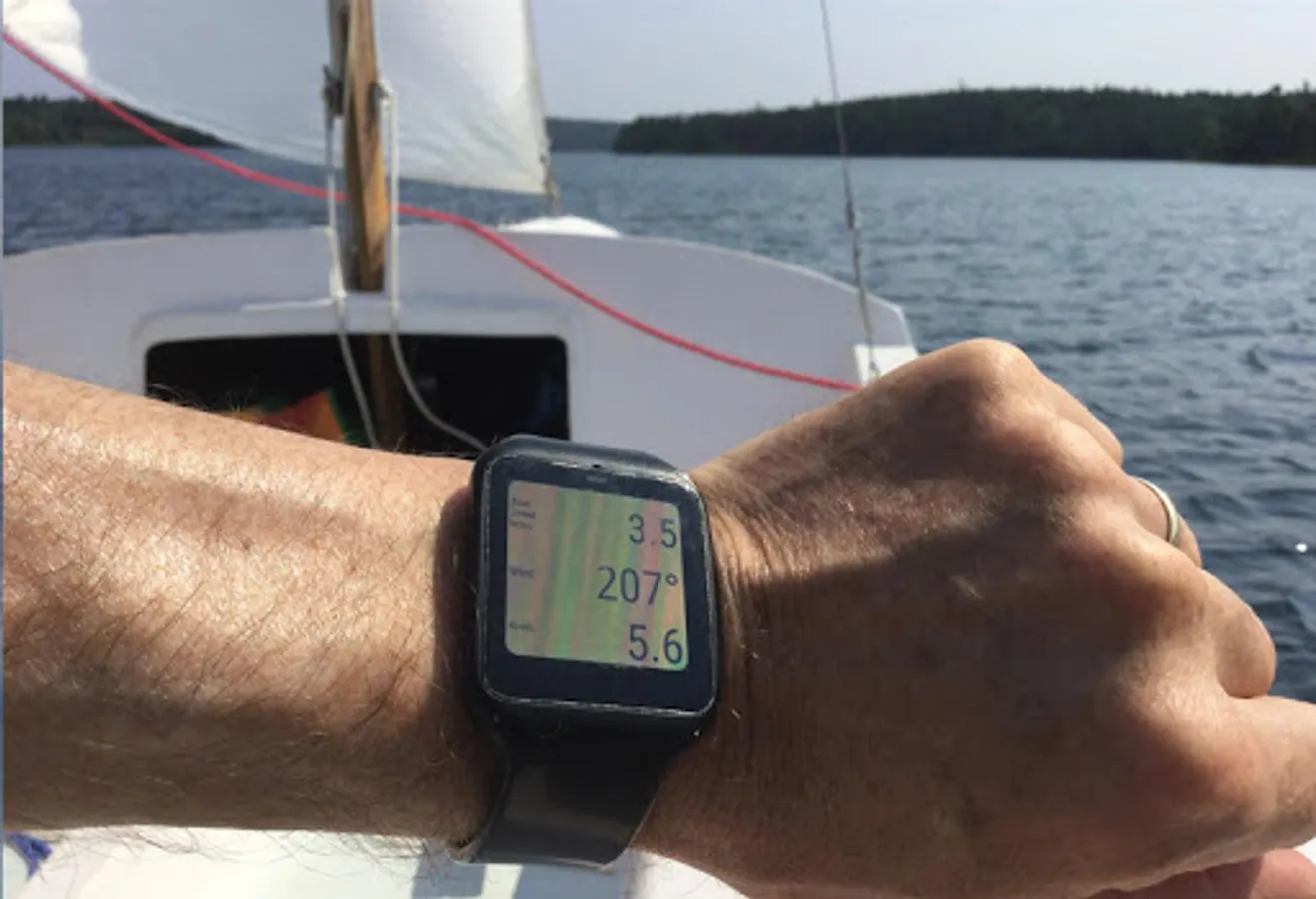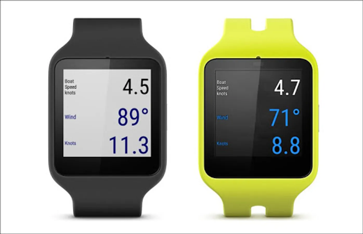 You can also use a smartwatch with this app. The Sony Smartwatch 3 is a good choice because it is waterproof, and has a reflective screen that is visible in direct sunlight. On a small sailboat where you may not have screens mounted on a binnacle or dashboard, just check the watch to see wind angle, wind direction, wind speed and boat speed. When the Wind Gauge app is in the foreground on the tablet/phone, whatever parameters you have on-screen are simultaneously displayed on the watch. Swipe to left on watch screen for Settings screen, with 5-second dim and brightness control.