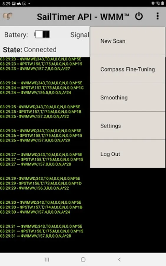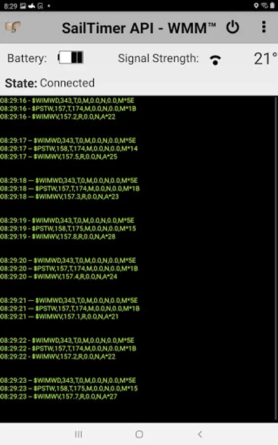 Data is shown in green text as the wireless data arrives from the Wind Instrument. Makes it easy to see if you have a Bluetooth connection, and to check the incoming data if needed. Pause/Unpause button if you need to make the green text easier to read. The app also sends official NMEA 0183 sentences for wind direction (MWD) and wind angle (MWV) to other apps for viewing. (Requires English or USA language/keyboard on your device).