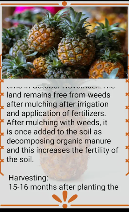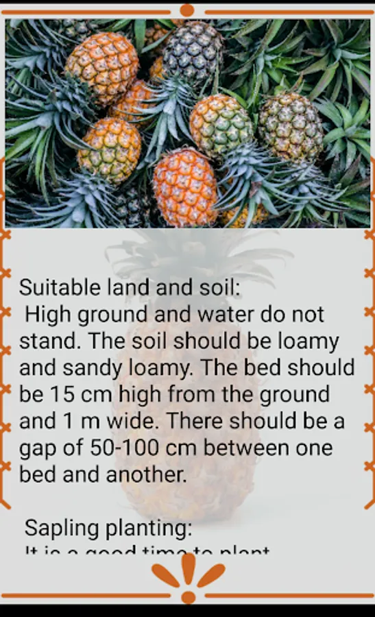 Pineapple is a delicious and nutritious fruit . This fruit is also profitable to the farmers . Many of us would like to cultivate Pineapple.This app will guide you through an easy process of cultivating Pineapple.