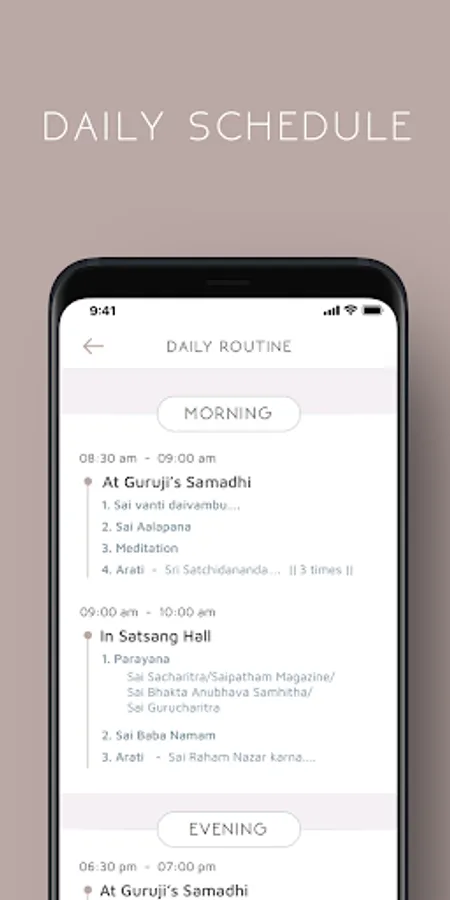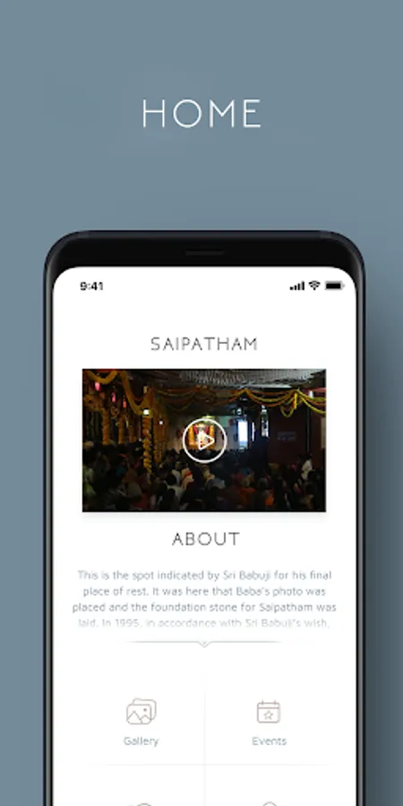 "Saipatham" app gives access to round the clock audio-video live streaming of Sri Babuji’s holy samadhi. It allows users to view the various activities at Saipatham and participate in daily Satsang which includes Naivedyam, Sai Namam, Parayana and Arati twice a day. Find information about the various festivals celebrated throughout the year, including their dates and schedules. Daily photos of Saipatham are uploaded for convenient viewing, sharing and downloading. The calendar feature in the Gallery allows users to view, share and download the photos of previous days and months. Easy access is provided to location, GPS directions, address and contact.