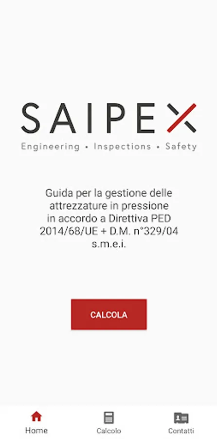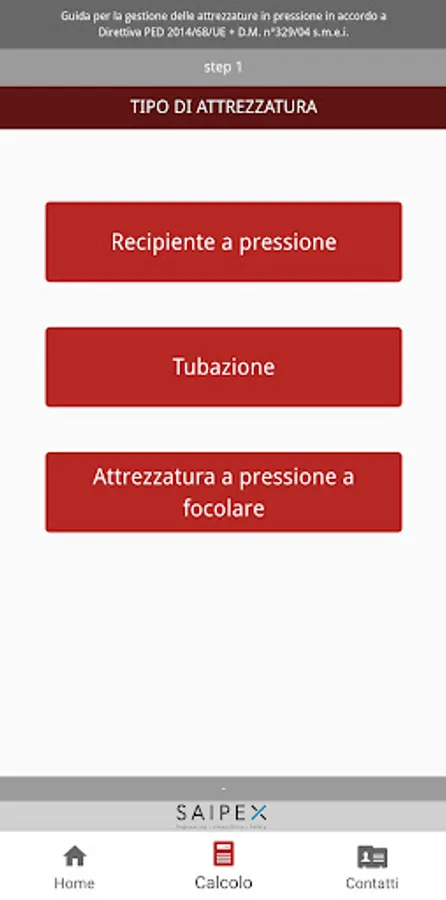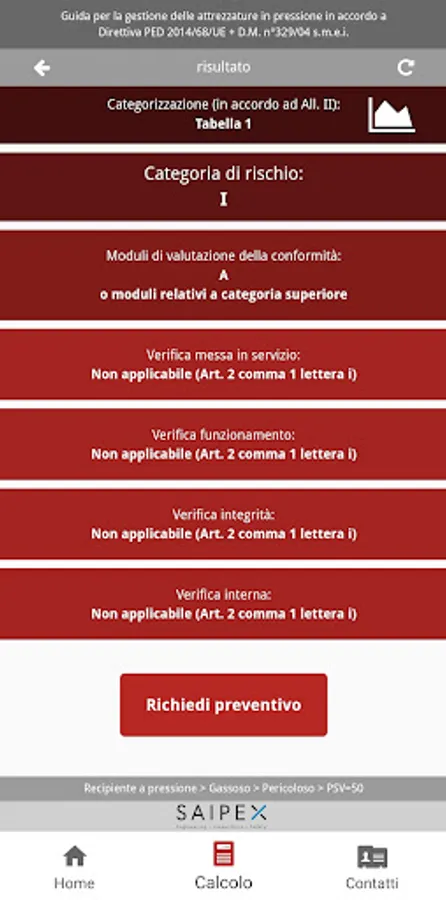 PED Directive 2014/68/EU and the D.M. n°329/04 as amended. The purpose of the application is to provide the categorization of the risk of pressure equipment in accordance with the PED Directive and to identify the user's legal obligations in terms of commissioning and periodic checks.