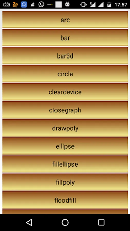 * circle, drawpoly, ellipse, fillellipse, fillpoly, getimage, line, lineto, linerel, moveto, moverel, pieslice,rectangle, draw shapes, moving car, smiling face animation, paint program, bar chart, pie chart, web browser program, traffic light simulation, etc...