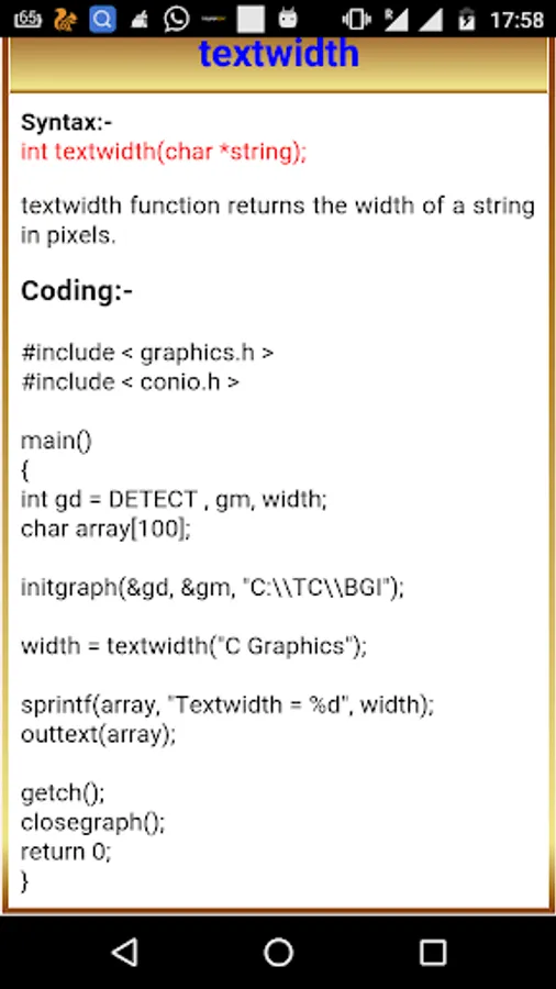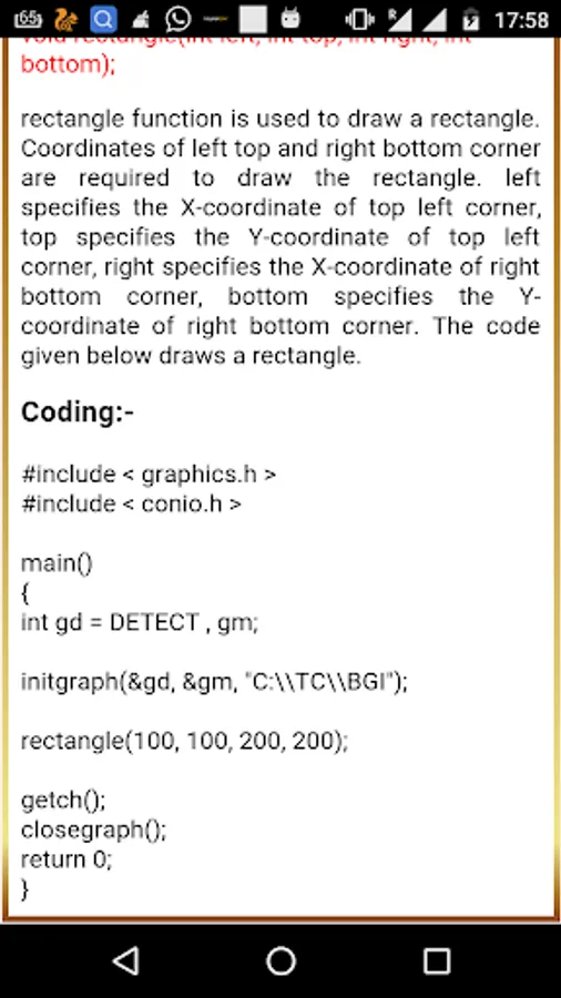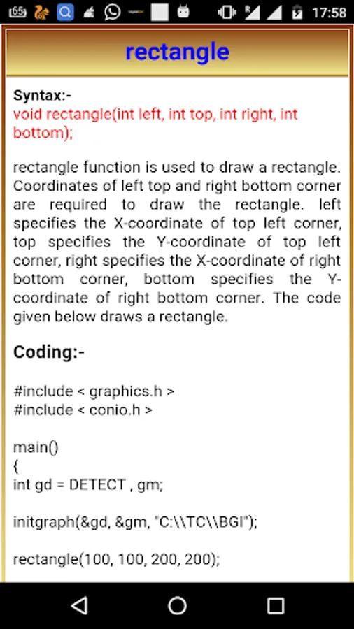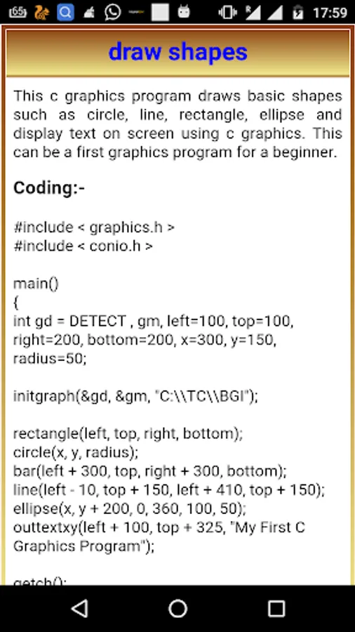 This C Graphics tutorial app is very useful for beginners to learn basic programs as well as advanced programs. This app covers Important programs for interview questions. Each program explained with output.