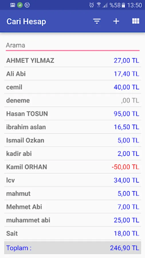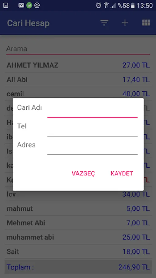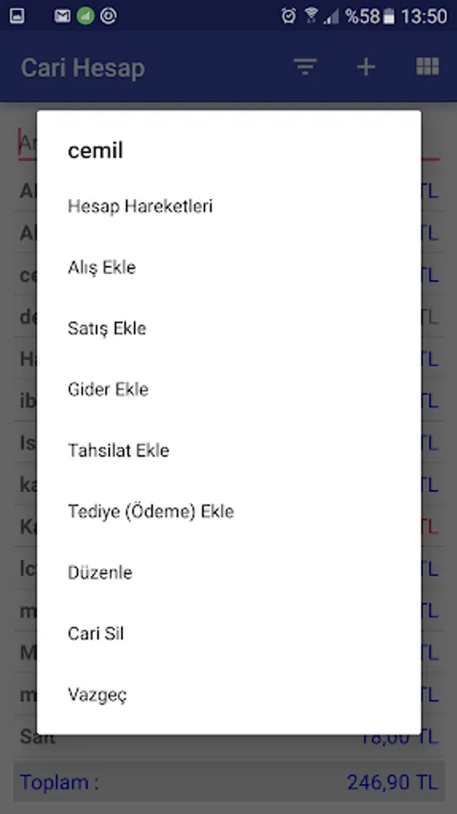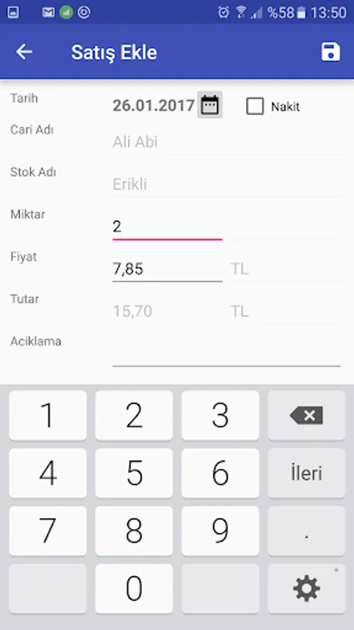 Cari İşlemler, Alış, Satış, Tahsilat ve Tediye İşlemlerini rahatlıkla takip edebileceğiniz. Raporlarla analizlerinizi yapabileceğiniz bir bulut sistemdir. Kayıtlarınız hiç bir şekilde kaybolmaz ve şifreli bir şekilde sunucumuzda tutulur. İnternetsiz ortamlarda çalışmaz. Birden fazla telefondan aynı kullanıcı adı ve parola ile ortak hesap tutlabilir. İlk 30 gün ücretsizdir..