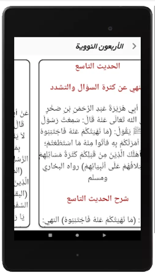 The Remembrance of the Forty Hadiths of An-Nawawi application includes 42 honorable prophetic hadiths with an explanation of each hadith preferably