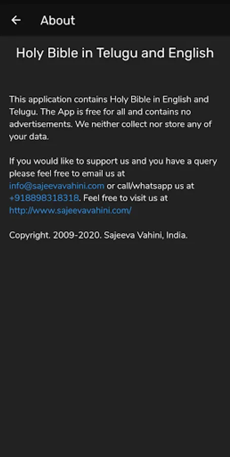 Sajeeva Vahini is a free mobile app with no advertisements. This app contains Holy Bible in English, Telugu and English Lo Telugu as a complementary feature. We neither collect nor store any customer data or information within the app.