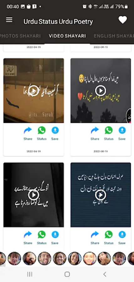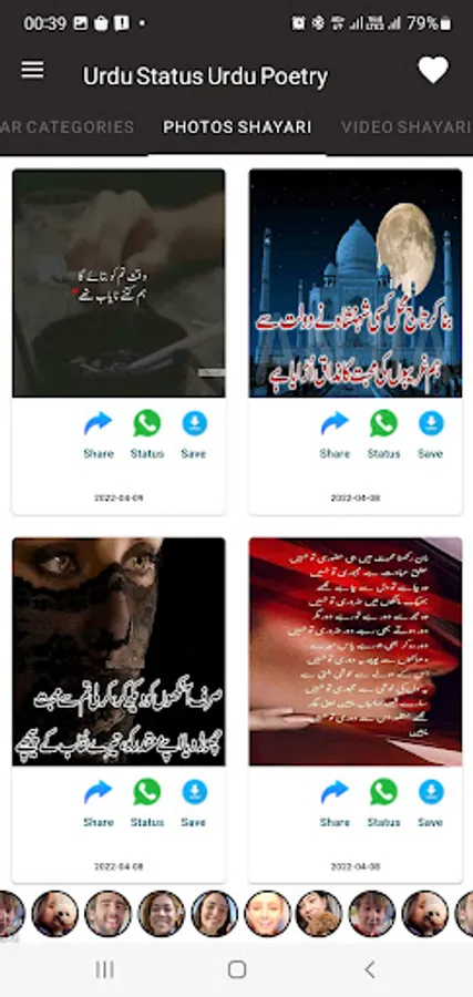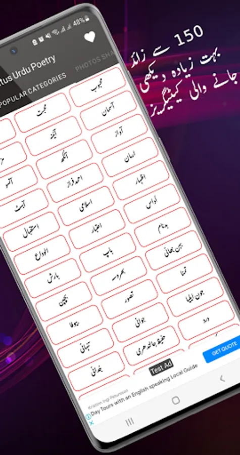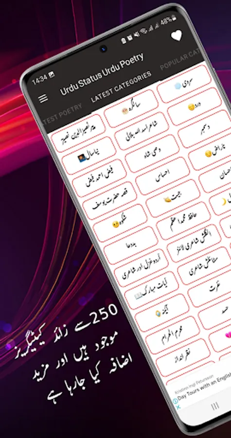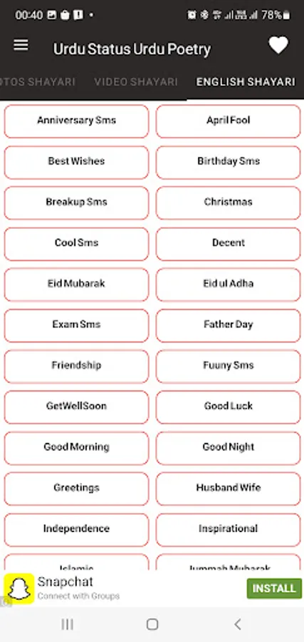 Good Morning, Night, Zindgi, Ghum, Tanhai, Zid, Dhoka, Badnam, Wqt, Islami ,Mosam, Yad, Birthday, Wada, Dosti, Zakham, Humsafar, Judai, Ishq, Nafrat, Chaiy, Eid, Dua, Mout, Zamana, Dill etc