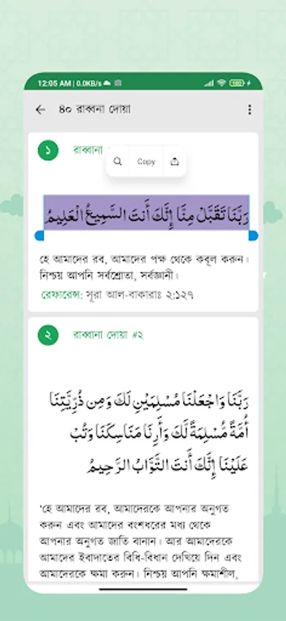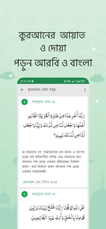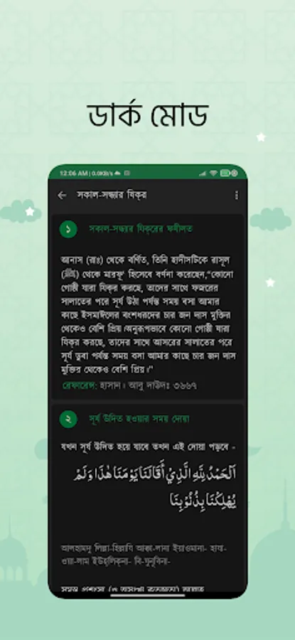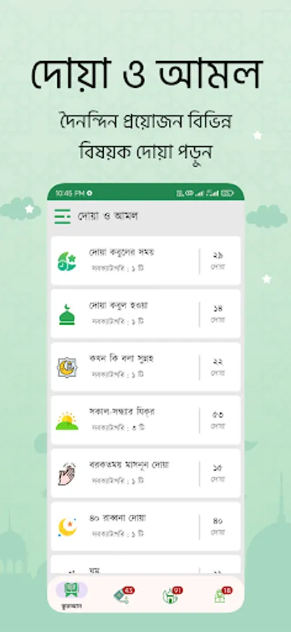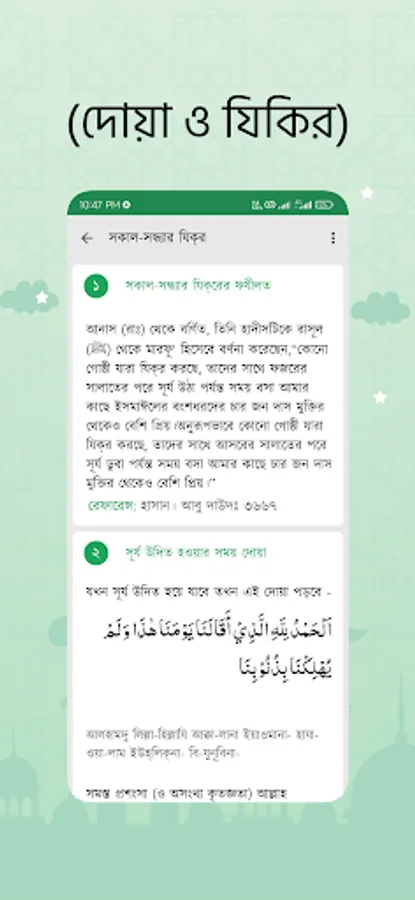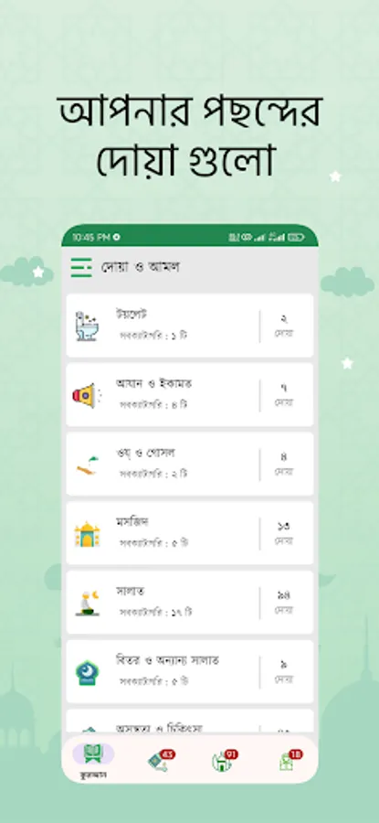 এই অ্যাপটিতে রয়েছে ৪৩টি বিভাগে 1000+ মাসনূন দোয়া এবং যিকর পাবেন। সকাল-সন্ধ্যা, শিশু, প্রার্থনা, রমজান, হজ/ওমরাহ এবং কুরআনের দুআস (রব্বানা দুআস) এর মতো সমস্ত অনুষ্ঠানের জন্য বিভিন্ন ধরণের দুআ এখানে আরো পাওয়া যাবে।