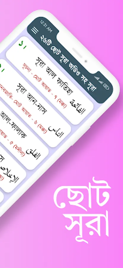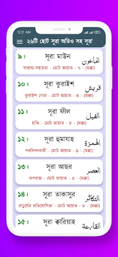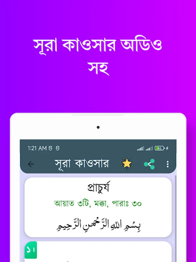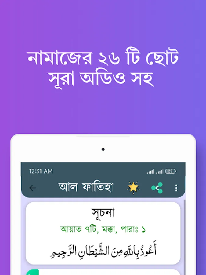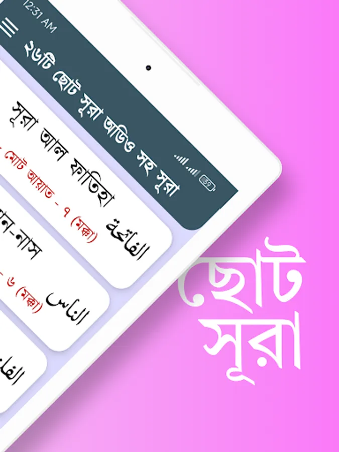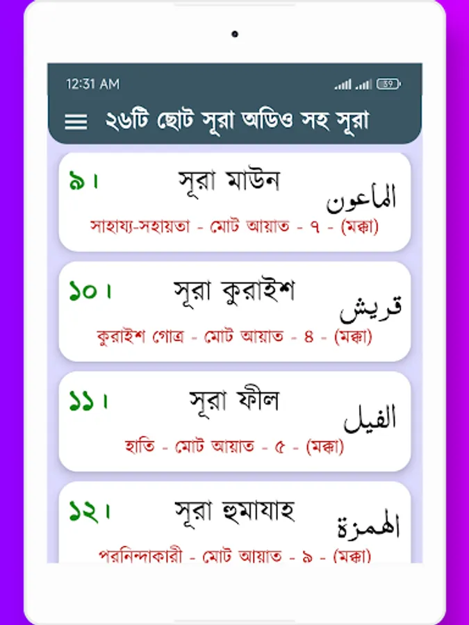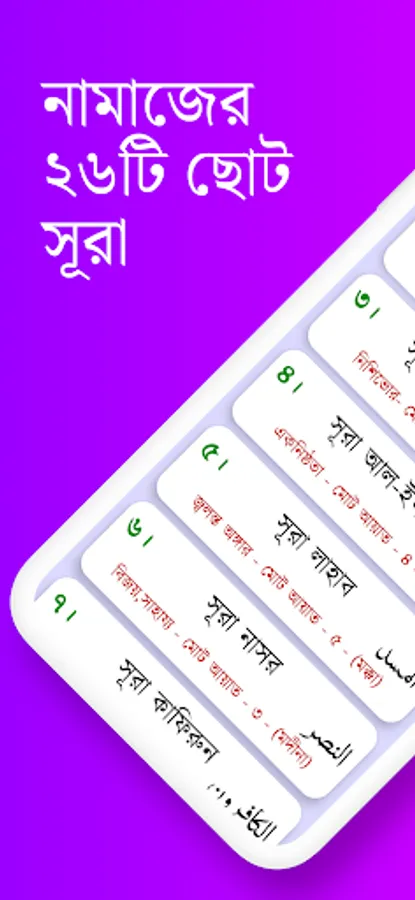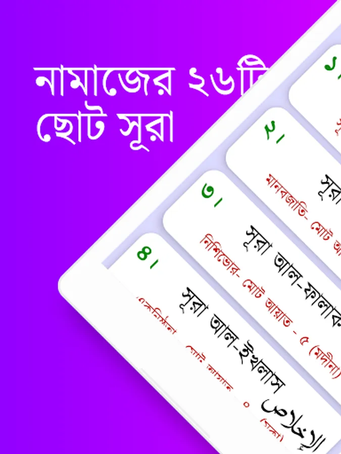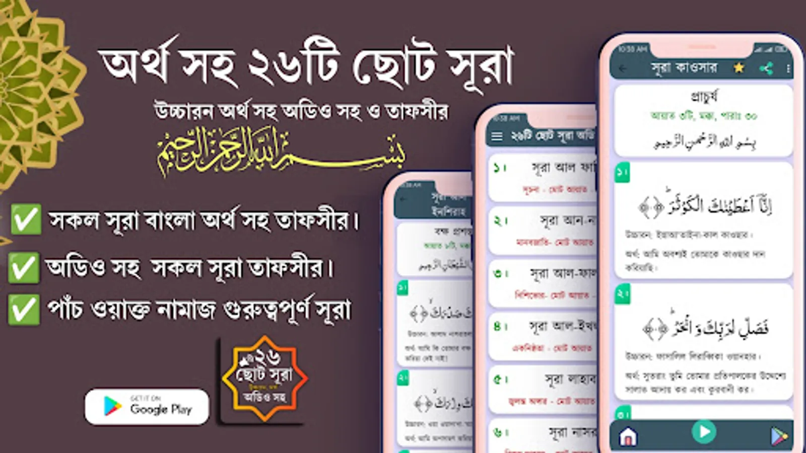 এখানে ২৬টি ছোট সূরা বাংলা উচ্চারণ সহ অর্থ, mp3 ফাইল এবং সূরাগুলির তাফসীর হয়েছে। ইন্টারনেট ছাড়া অডিও চলবে কোন প্রকার ডাউনলোড করতে হবে না যাতে করে খুব সহজেই সূরাগুলি শুনতে, পড়তে ও বুঝতে পারেন। যারা এখনো নাময পড়ার জন্য সূরা শিখেন নাই এই App থেকে খুব সহজেই শিখতে পারবেন অথবা আপনার ঘরে যদি কোন ছোট বাচ্চা থাকে তাদেরকেও শিখাতে পারবেন এবং সূরা সমূহের বিস্তারিত ব্যাখ্যার জন্য রয়েছে তাফসীর। এবং এই সূরা গুলো অতিরিক্ত অনেক প্রয়োজনীয় ২৬টি ছোট সূরা।