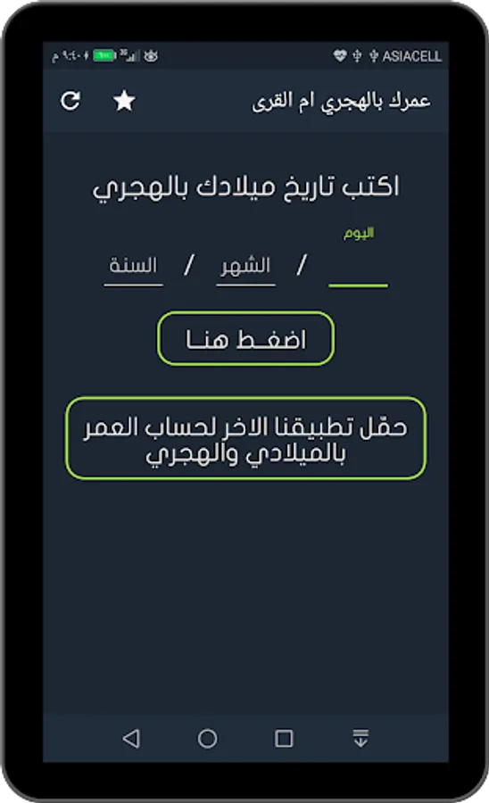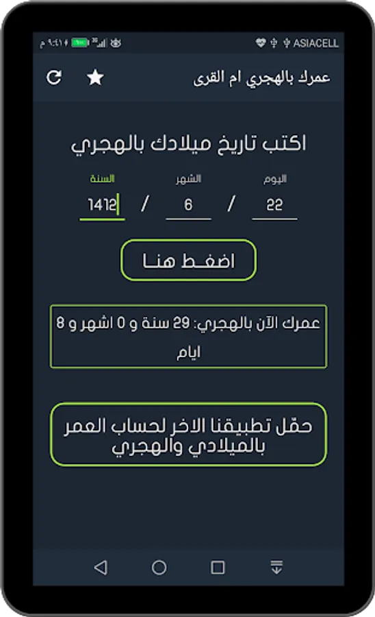 Hijri Age Calculator is a useful application that allows users to calculate their age using the Hijri calendar, which is the calendar used in the Islamic world. The application features an easy-to-use and convenient interface, where users can enter their date of birth using the Hijri calendar, and the Hijri age will be calculated for them automatically.