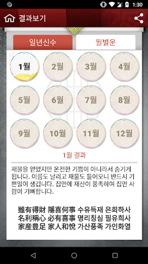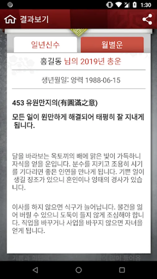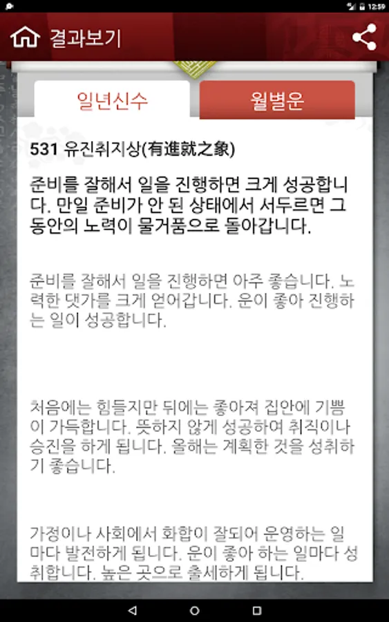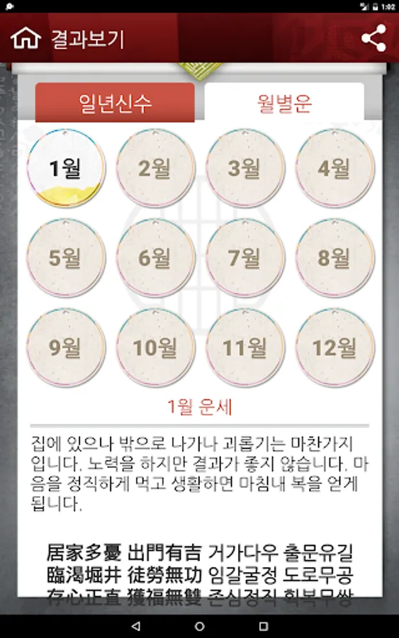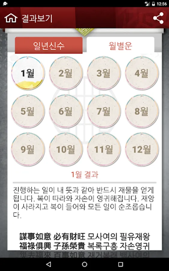 You can share it with KakaoTalk and Kakao Story by clicking the Share button in the upper right corner after seeing the secrets or horoscopes.
