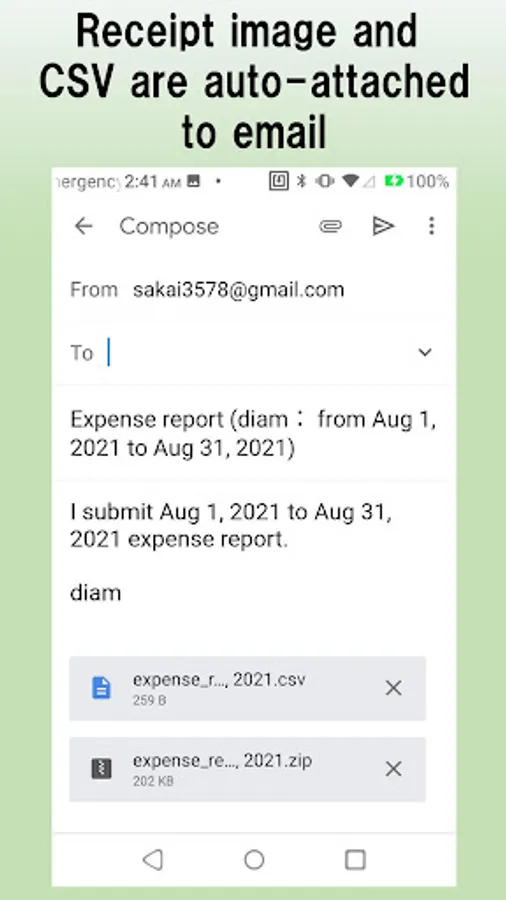-You can generate CSV data for expense settlement from the input results on your smartphone, automatically attach it to an email, and send it to the aggregater.
