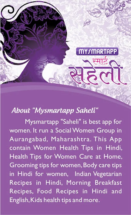 Mysmartapp "Saheli" is best app for women. It run a Social Women Group in Aurangabad, Maharashtra. This App contain Women Health Tips in Hindi, Health Tips for Women Care at Home, Grooming tips for women, Body care tips in Hindi for women, Indian Vegetarian Recipes in Hindi, Morning Breakfast Recipes, Food Recipes in Hindi and English, Kids health tips and more.