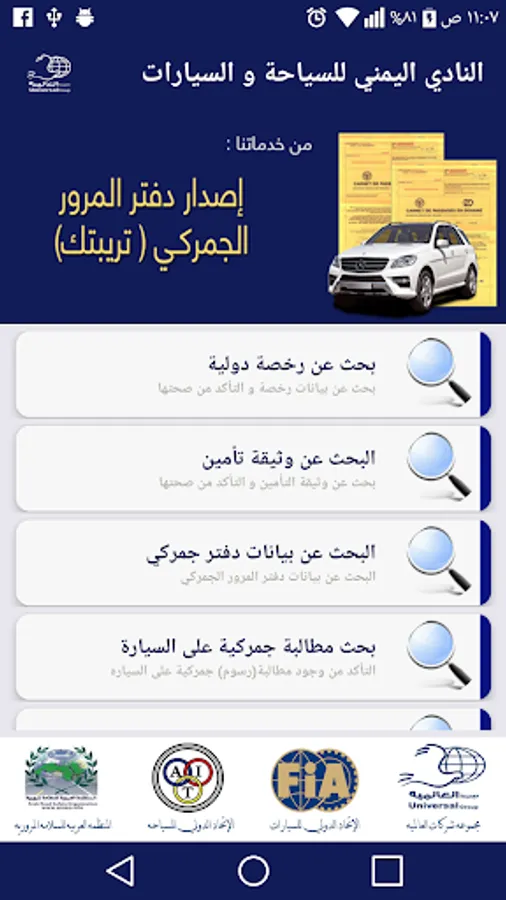 The product of this has Alathadan the adoption of the club in each country and its mandate to issue such books in his country, where the International Federation to send those books to the clubs after the work of insurance coverage has internationally to ensure that tariffs for customs countries entering the means of transport if it is re-exported or settlement established customs. From the above idea of the Yemeni tourism club and cars it was established at the end of the eighties and got the membership of the International Federation of Tourism came to the AIT membership of the International Automobile Federation FIA so that the Yemeni club could play that role in Yemen.