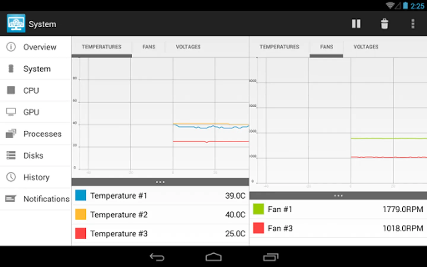 * Get graphs about your CPU (load, temperature, clock, power), GPU (load, clock, temperature, fan) and system (fans, temperature, voltages).