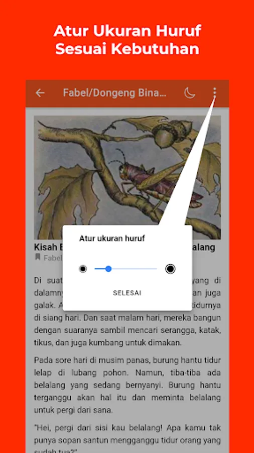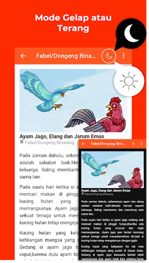 With dark and light mode features that you can use to adjust your condition when reading stories. In addition, now you can adjust the size of the letters.